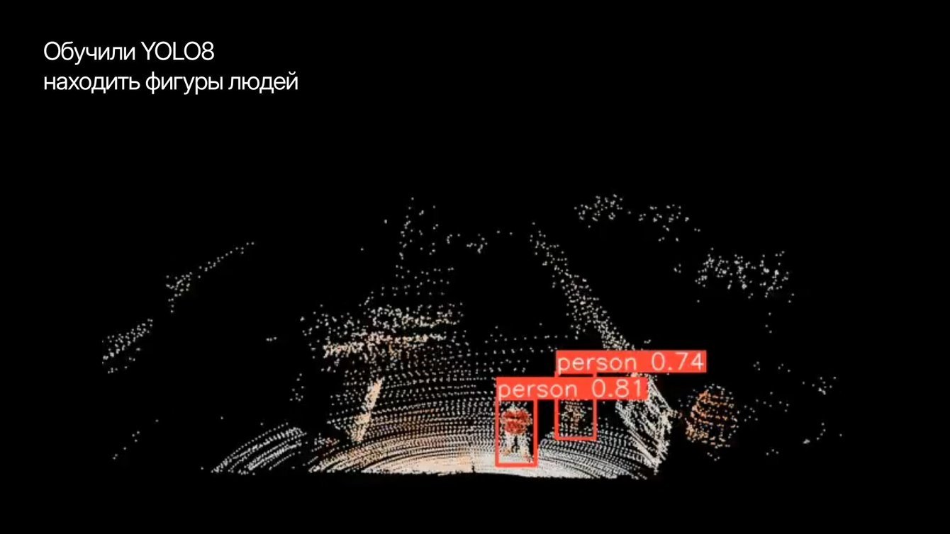 В нашем случае датасетом стали фигуры людей. Мы сделали 8000 фотографий с лидара, разметили людей и на этом материале обучили нейросеть. Вот как выглядят размеченные изображения, на которых мы натренировали YOLO8.