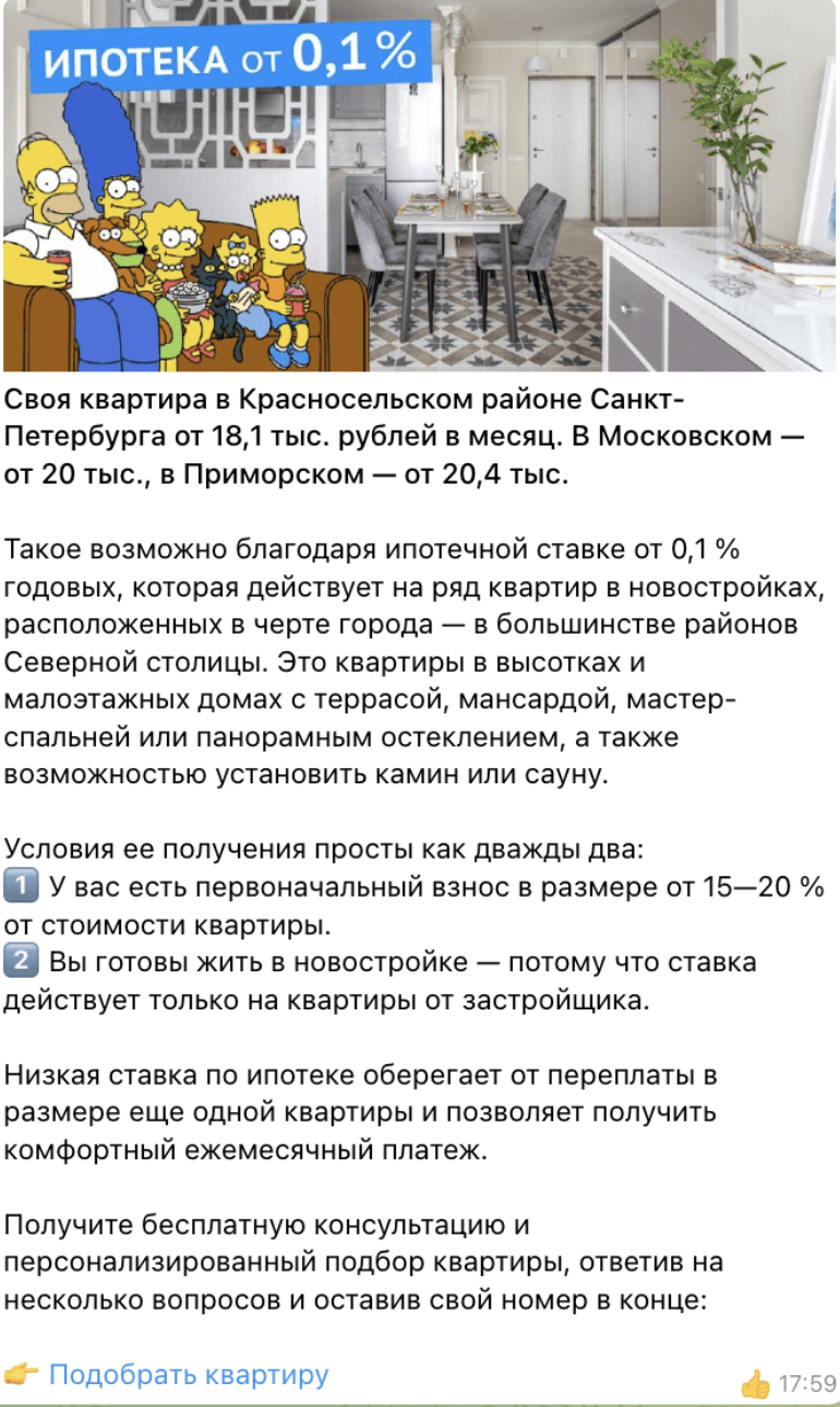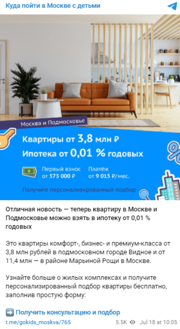 Telegram — отличный источник лидогенерации для объектов недвижимости. Он дает недорогие обращения — до 1,5 тысяч рублей в нашем случае, для Санкт-Петербурга и Москвы.