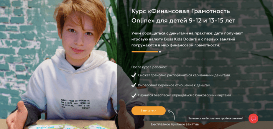 Сократили призыв на кнопке до одного слова "Записаться", всю дополнительную информацию разместили под стрелкой. Раньше здесь был длинный текст "Записаться на бесплатное пробное занятие".