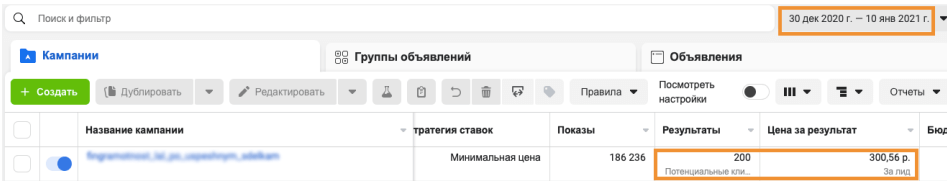 С 30 декабря по 10 января мы привели клиенту 200 лидов из Facebook* и Instagram*. CPL 360 рублей с НДС.