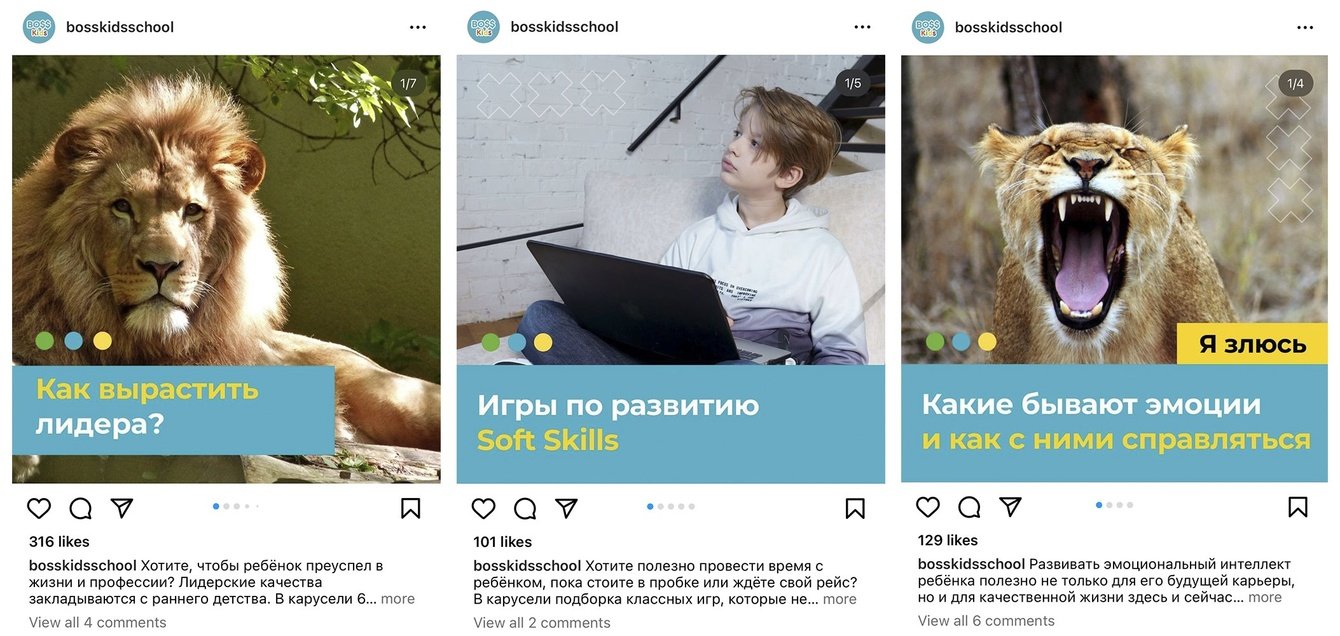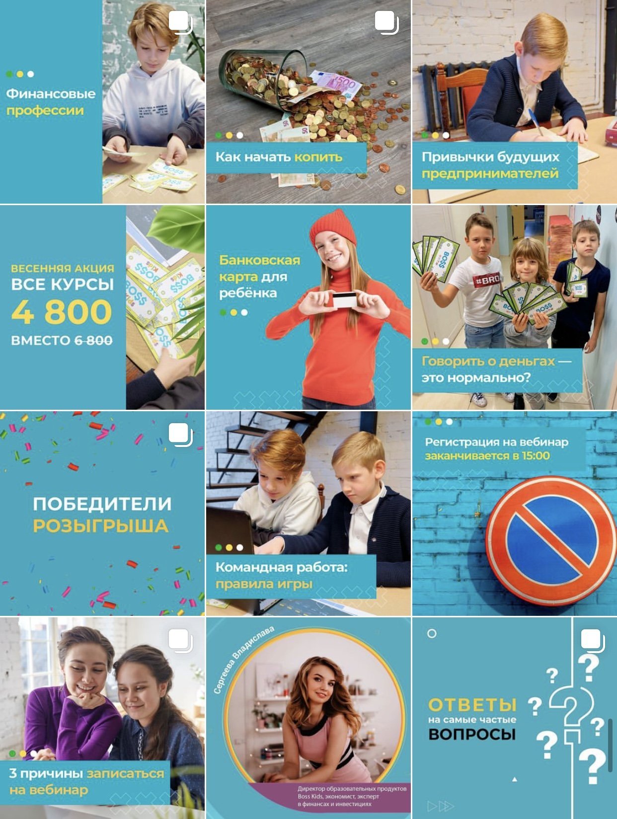 В качестве эмоционального посыла в соцсетях выбрали концепцию осознанного родительства, дружеской поддержки на пути развития и обучения детей. БоссКидс в соцсетях — это полезная информация о детской психологии, финансовой грамотности, инвестировании и развитии эмоционального интеллекта.