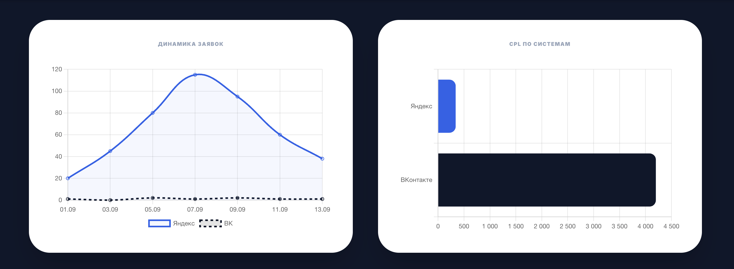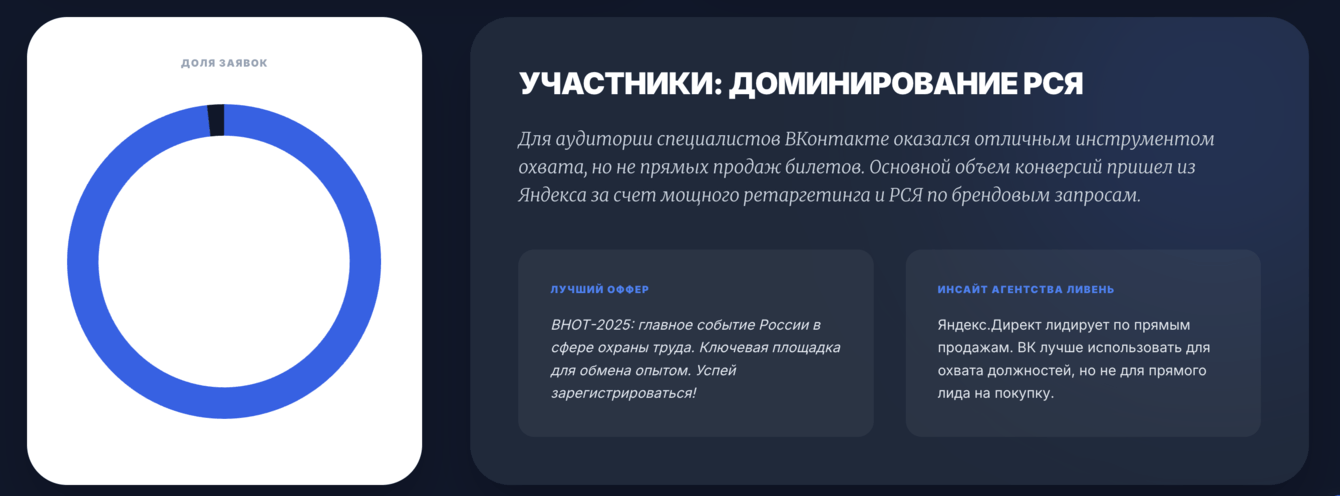 Массовый сегмент. Яндекс Директ (РСЯ) стал драйвером трафика и конверсий. ВК выступал как охватная площадка для ЛПР.