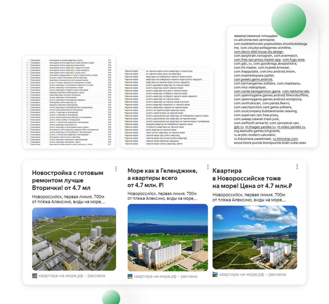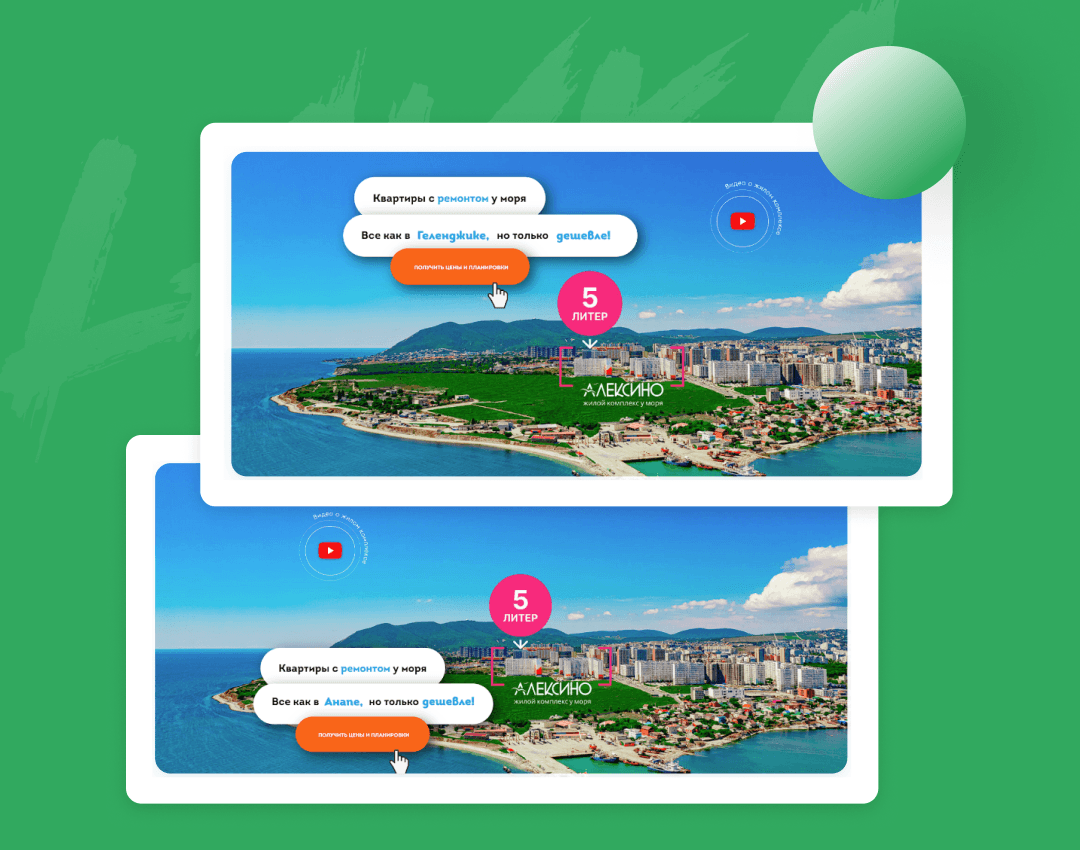 В качество посадки использовался мультилендинг с подменными экранами. Экраны делали под основной запрос типа «квартиры на море», а также под запросы других городов – Анапа, Геленджик.