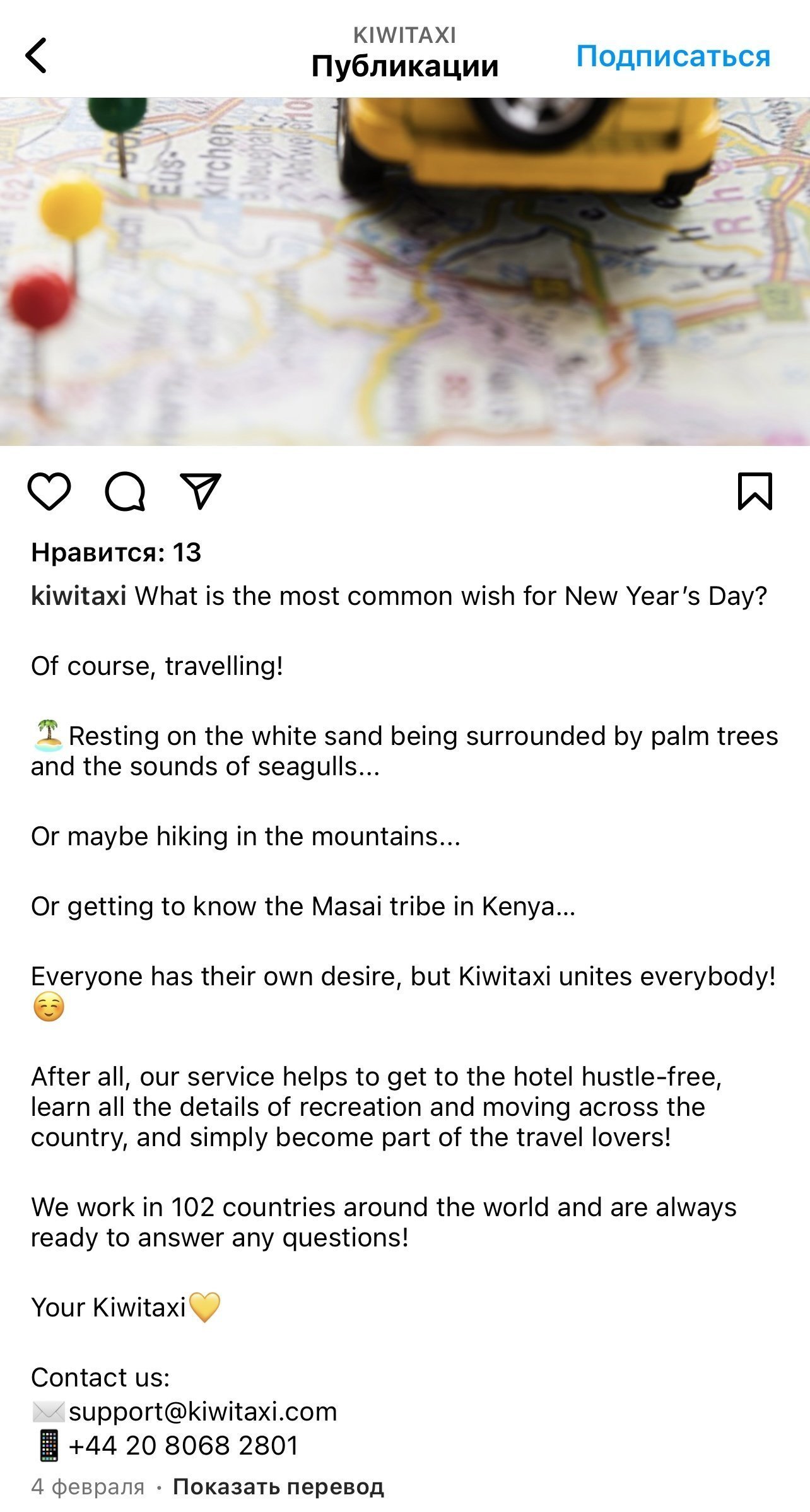 Нашей команде удалось: сформировать англоязычное и русскоязычное B2B и B2C сообщество (отдельные аккаунты) вокруг бренда KiwiTaxi, успешно настроить рекламную кампанию с целью лидогенирация (регистрация туристических агенств в партнерской сети) и понизить среднюю стоимость регистрации более чем на 40%.
