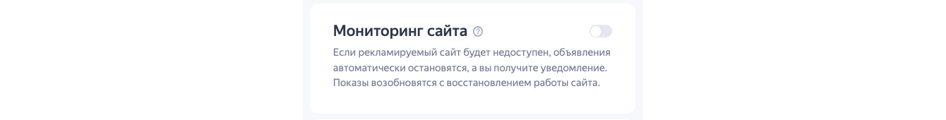 Это опция в настройках рекламных кампаний, которая позволяет отслеживать работоспособность веб-ресурса, на который идет реклама. Другими словами, это механизм, который контролирует, работает сайт или нет, чтобы не получилось так, что реклама идет, а сайт не открывается. А люди, которые перейдут по рекламе просто не попадут на нужную посадочную страницу, не ознакомятся с информацией. Причем деньги за клик в таком случае спишутся. Задача мониторинга сайтов — пресечь такую ситуацию. Как только сайт не отвечает на запросы (не работает), функция мониторинга отключит показы рекламы.