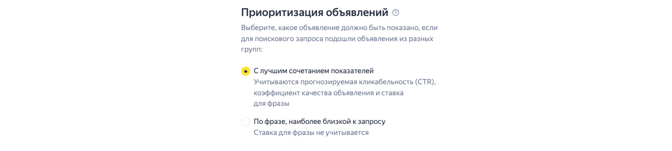 — в приоритизации объявлений выбран вариант показа «с лучшим сочетанием показателей».