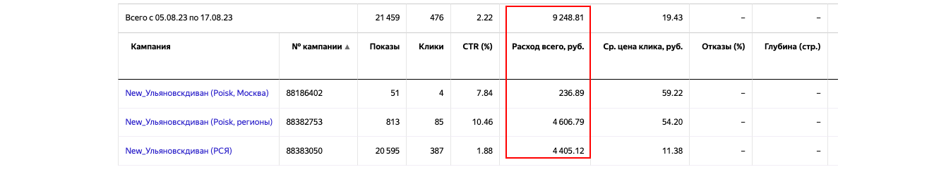 — отсутствовали стоп-площадки в РСЯ (рекламная сеть Яндекса), что свидетельствует о том, что оптимизация рекламных кампаний не велась;