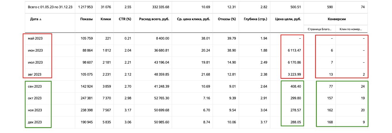 В конце августа 2023 года мы внесли все необходимые правки и с сентября запустили оптимизированную рекламную кампанию. Ниже скриншот с динамикой показателей в разрезе по месяцам (4 месяца до и 4 месяца после оптимизации).
