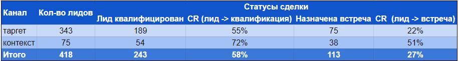 Итого за месяц работы мы получили 418 лидов, что на 12% превысило план. Как мы и ожидали таргет дал нам основную часть лидов (82%) и по более низкой цене, чем контекст (на 66,9% по итогу). Но при этом мы понимали, что эти лиды будут более холодные и у них будет процент в квалифицированного лида меньше.