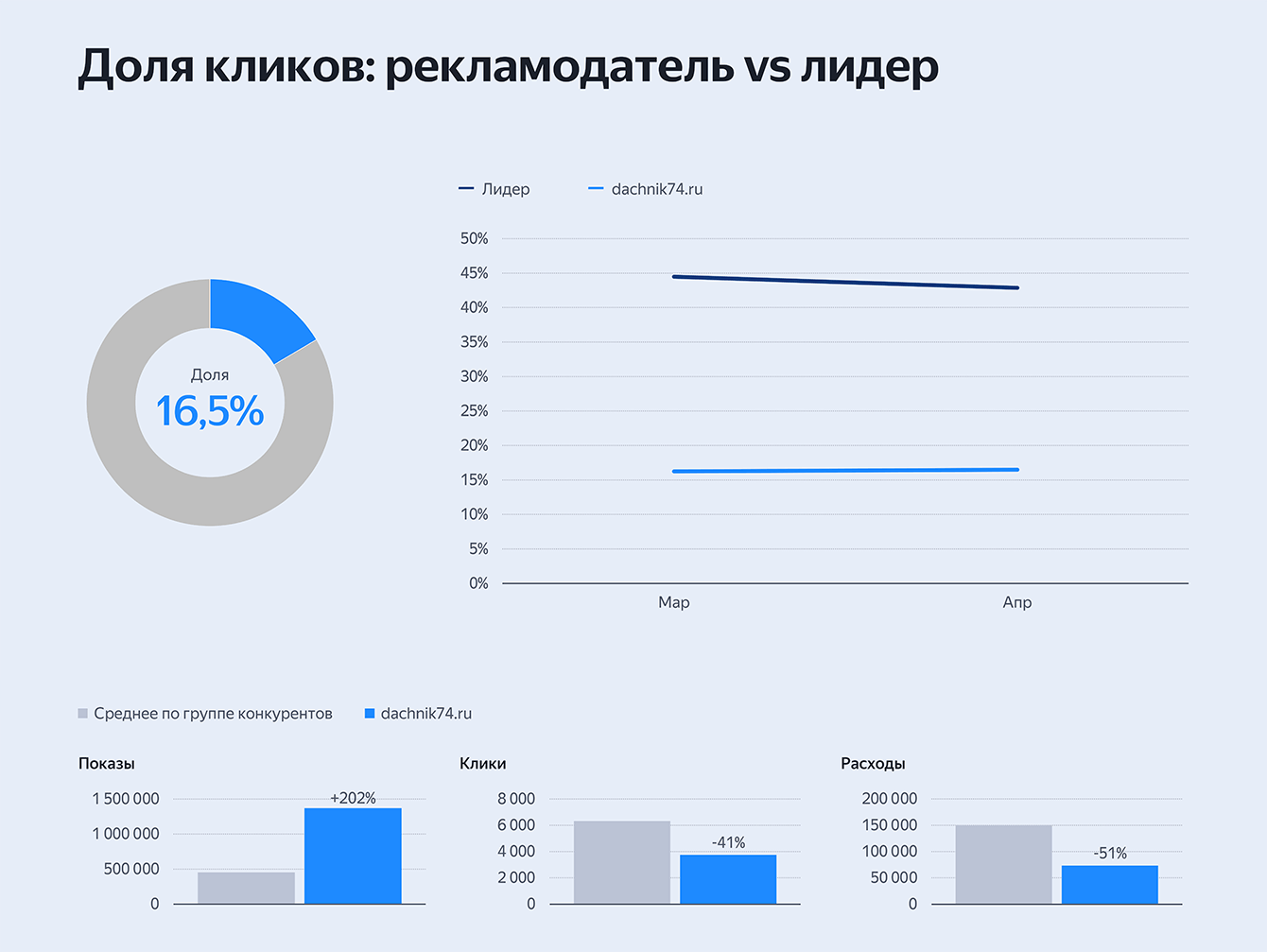 Перед началом продвижения в этом сезоне совместно с аналитическим отделом Яндекса был проведен конкурентный анализ в нише для понимания текущего уровня рынка и занимаемого нашим клиентом места в нем. В итоге приведенной аналитики было выявлено, что по количеству кликов компания "Дачник" занимает долю рынка 16,5%, при этом лидер рынка забирает себе более 40% всех кликов.