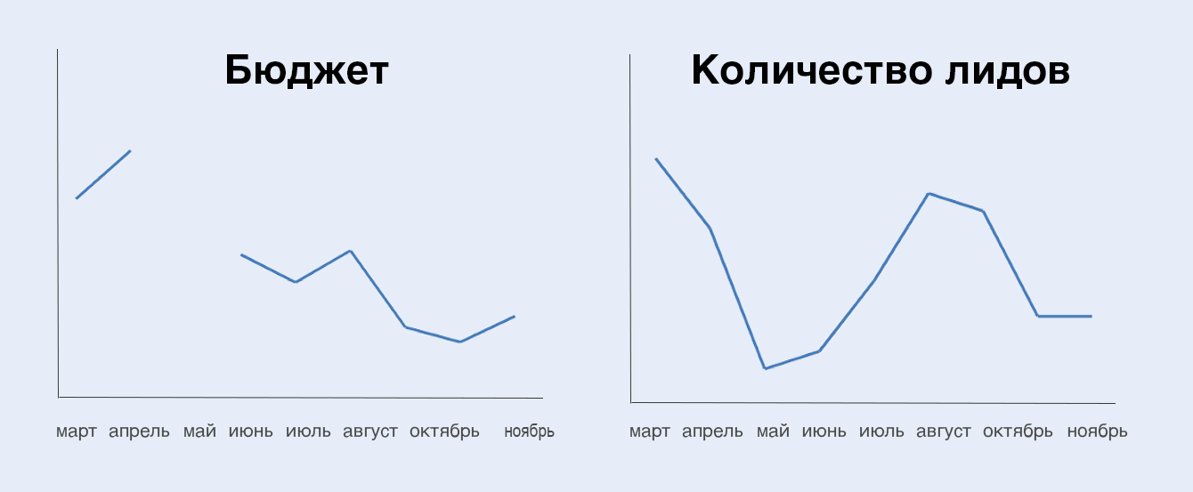 Такая доля рынка обусловлена тем, что средний расход клиента на контекстную рекламу в 2-3 раза меньше расходов конкурентов. Это связано с несколькими внутренними факторами компании, например, с переносом сайта клиента и изменением его названия, которые пришлись на этот сезон.