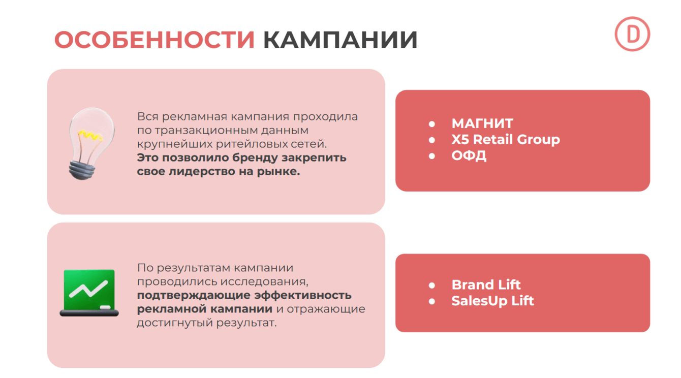 Задача — повысить уровень знания бренда. Этапов работы три: анализ рынка, продвижение по данным ОФД, исследования по факту проведения РК.