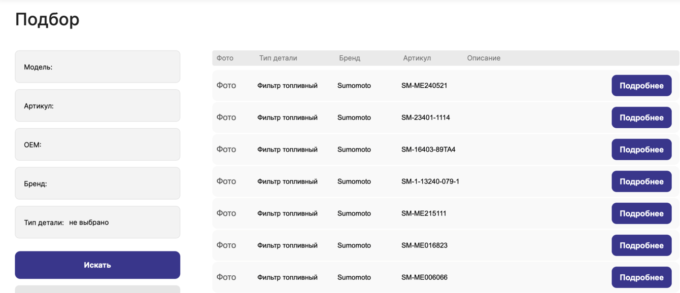 1. Быстрый и точный подбор по артикулу, бренду и типу детали