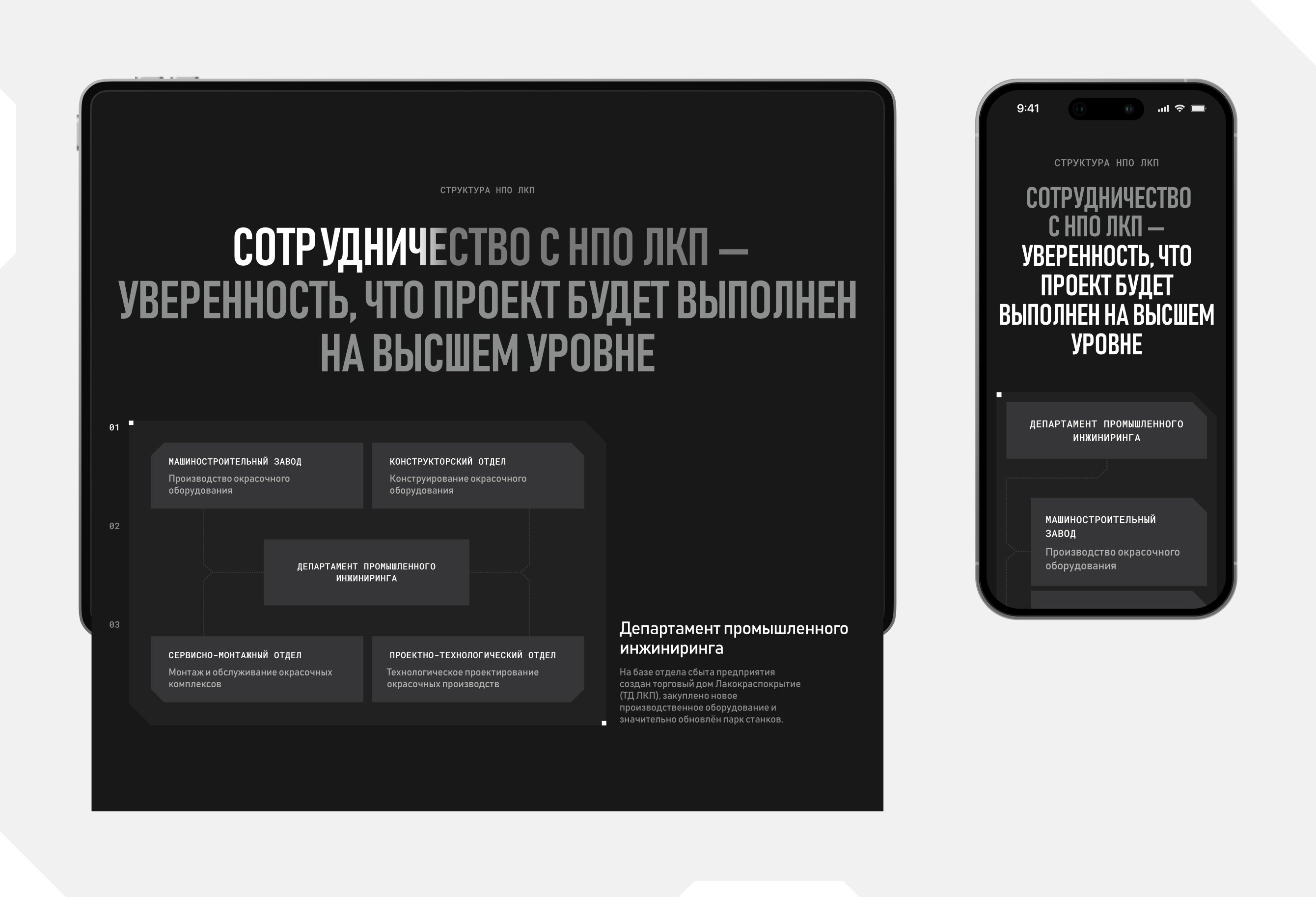 ✔️ Разработали запоминающийся дизайн сайта. Его основная особенность — визуальная подача. Фотографии производства, продукции и сотрудников ЛКП лежат в основе каждого блока сайта и помогают создать образ надежного партнера, демонстрируют опыт компании и сразу погружают в специфику отрасли.