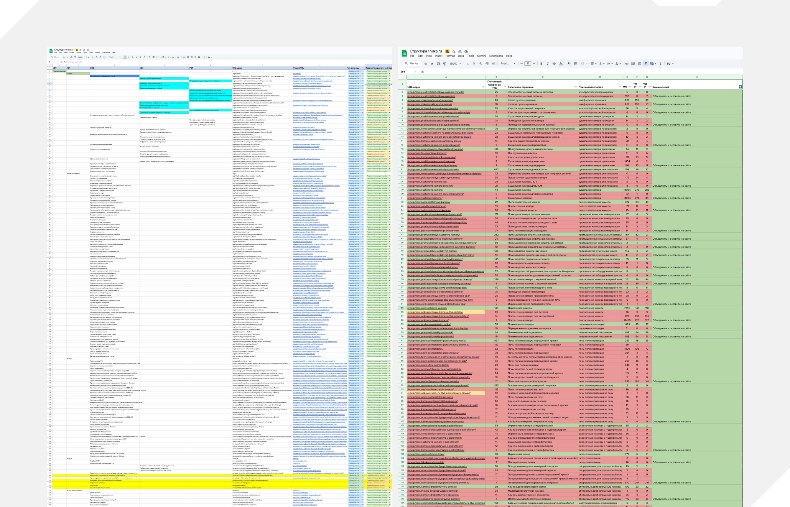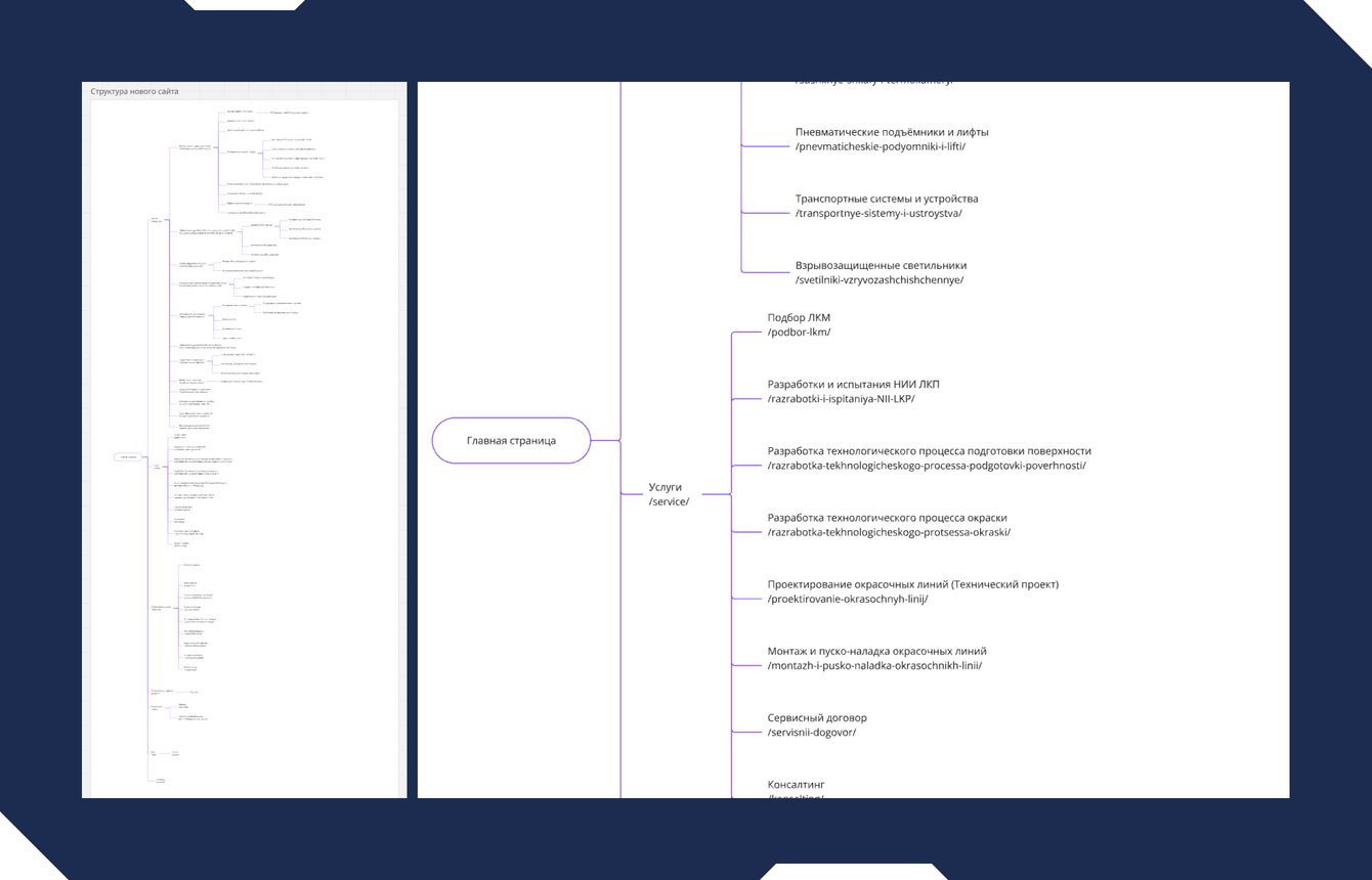 Эту задачу мы решали параллельно с этапом аналитики. Здесь мы проделали огромную работу — разобрали старую структуру сайта, оценили порядка 350 URL и выбрали из них страницы с самой большой посещаемостью и частотностью, чтобы избежать на новом сайте каннибализации трафика.