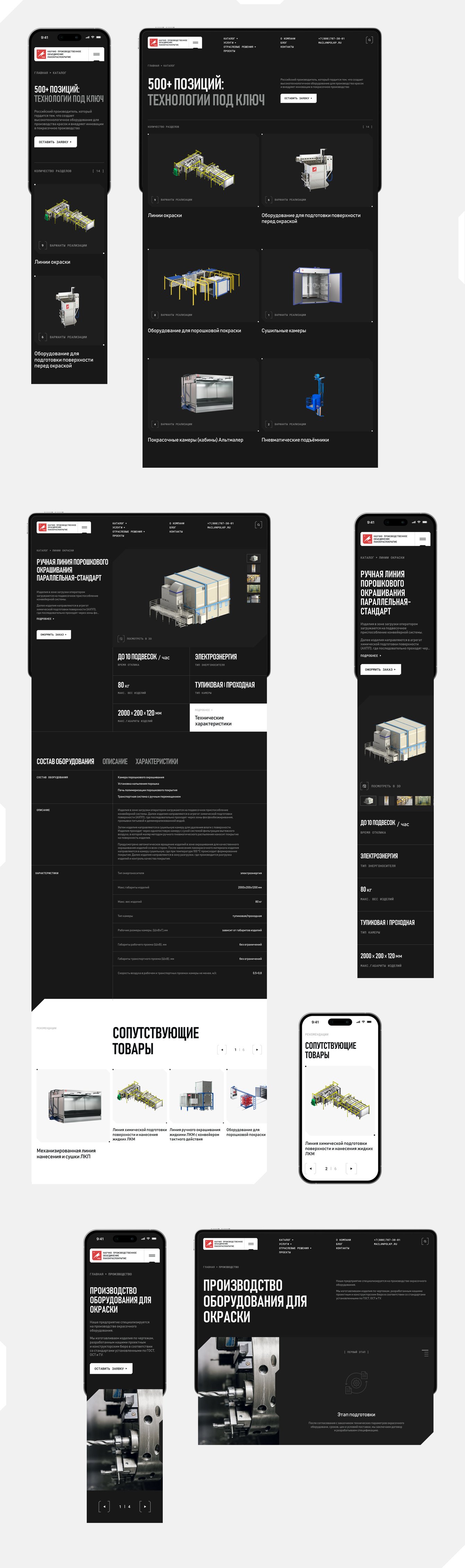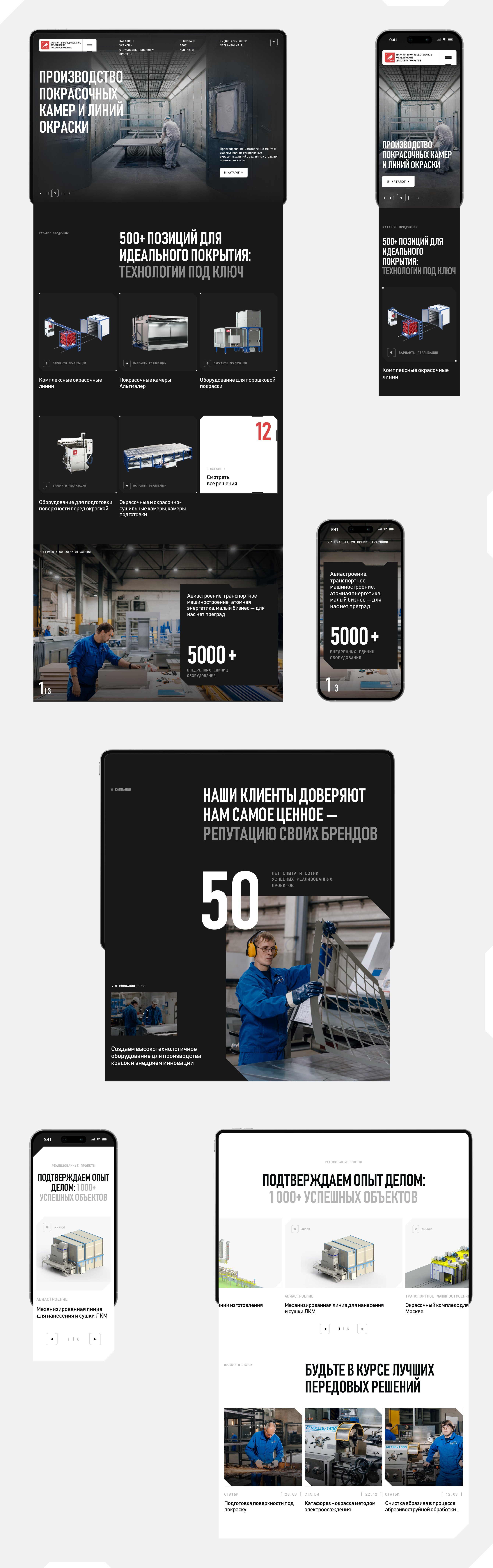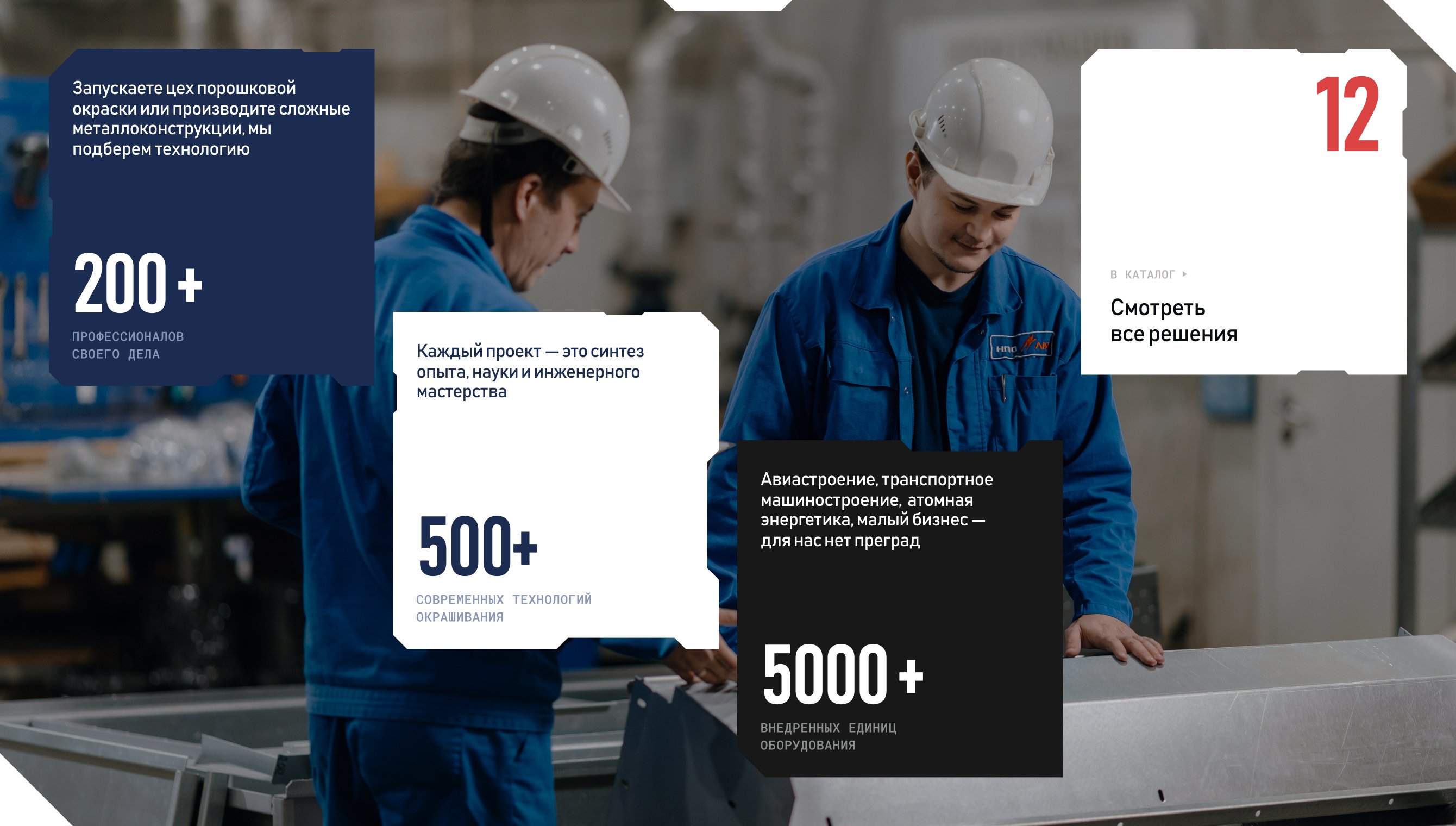Мы пробовали много разных вариантов в поисках того самого уникального визуала и стиля с использованием фотографий. Важно, чтобы посетитель с первого взгляда понимал, что речь идет о производстве лакокрасочного оборудования.