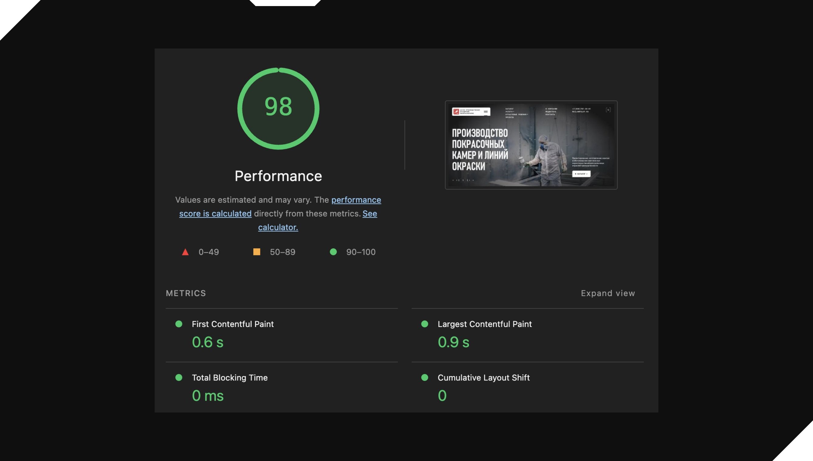 Скорость сайта — 98 баллов по Lighthouse (Performance). Это топ-уровень для B2B-промышленности, где крупные сайты обычно набирают 30-60 баллов.