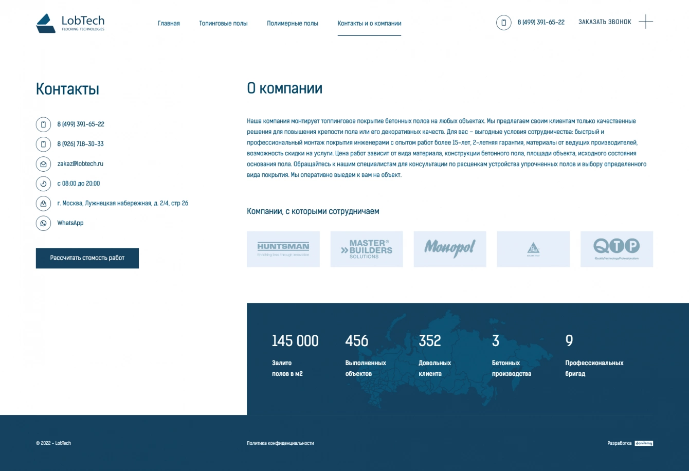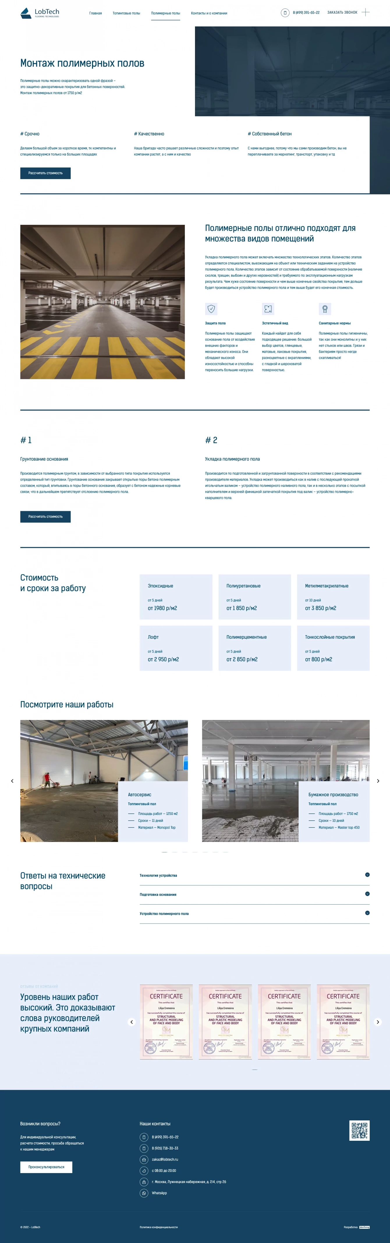 Не удивился я, когда посмотрел конкурентов. Почти все сайты созданы шаблонно, как будто кто-то задал один стиль и структуру, а потом все стали копировать друг у друга, меняя только название. Я сделал все вплоть наоборот, выделил компанию очень неординарным, но современным и удобным дизайном. Клиента сразу предупредил, что необходимо будет показать себя иначе. Составил удобную структуру и отдельно рассказал о топпинговых и полимерных полах. На каждую страницу можно будет настроить свою рекламу, тем самым создастся впечатление точного присутствия клиента и удовлетворения его запроса.