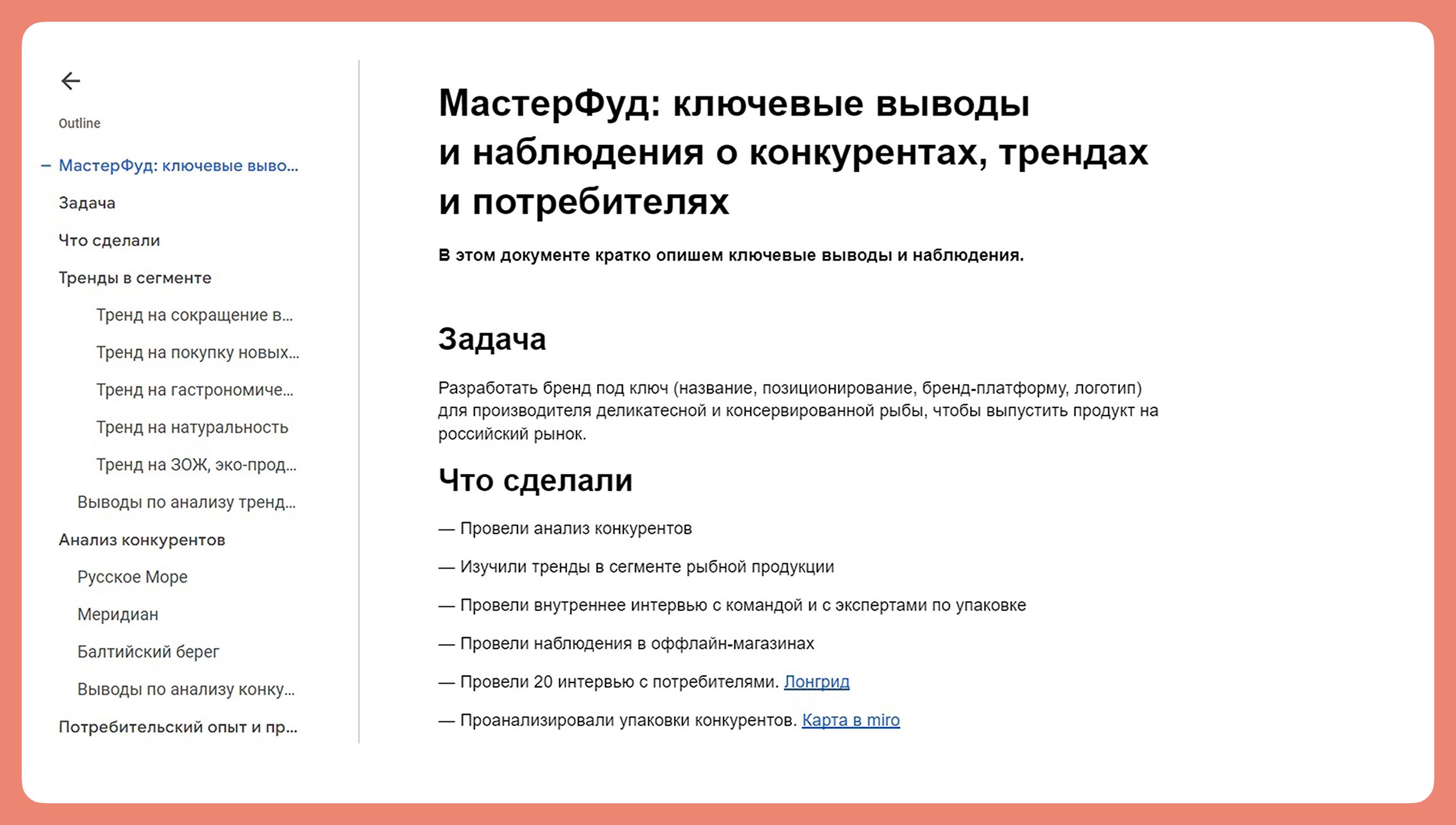 Все наблюдения и выводы мы зафиксировали в документе, который передали клиенту. Эти данные мы использовали при разработке бренда