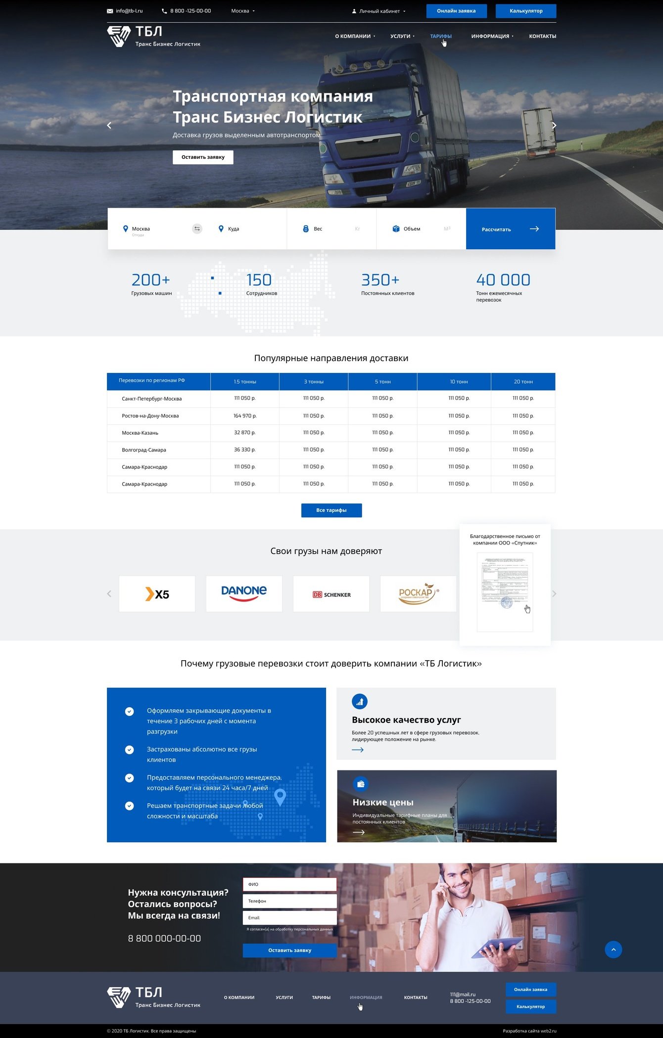 В сентябре 2019 года к нам обратился Заказчик с целью создать современный сайт для транспортной компании, который должен соответствовать современным условиям сайтостроения. Компания "ВЕБ2" взялась за данный проект и в рамках разработки был разработан стильный сайт, адаптированный под все известные экраны, как мобильных устройств, так и десктопных. Был реализован калькулятор грузоперевозок по всем направлениям России. Также компания "ВЕБ2" интегрировали на сайт автоматическое ежедневное обновление самых популярных маршрутов ориентируясь на цену топливо и километраж.
