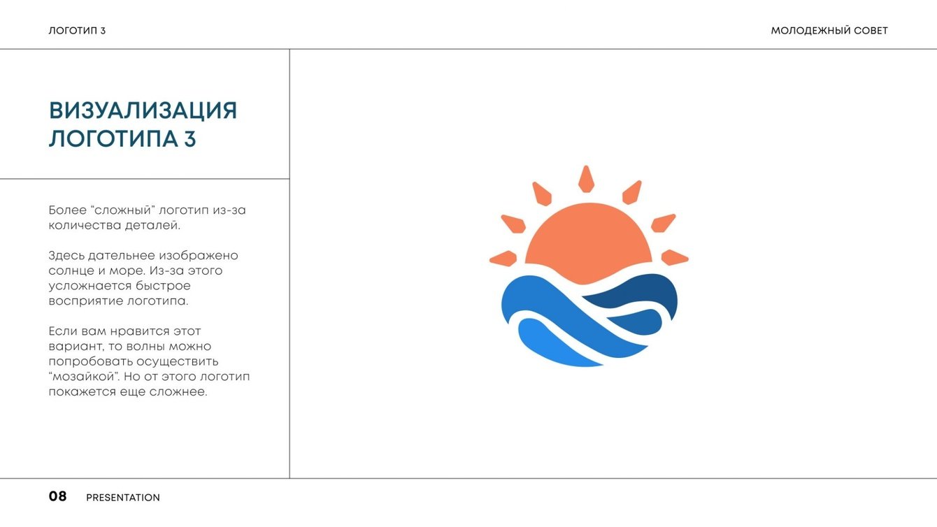 Решение задачи максимально простое - разработали варианты логотипов, которые описывают располождение в туристическом месте, где море, пляжи и солнце. А далее сделали гайдлайн по выбранному логотипу.