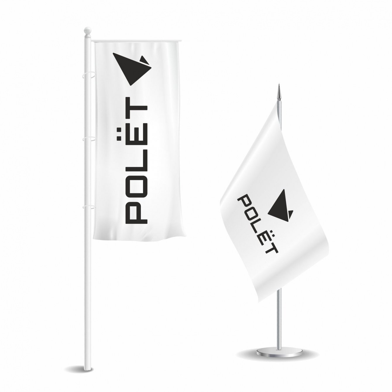 Фирменный знак изображает стилизованные крылья, тем самым поддерживает название фирмы «Полет» и слоган «Только вперёд, стремление ввысь!»