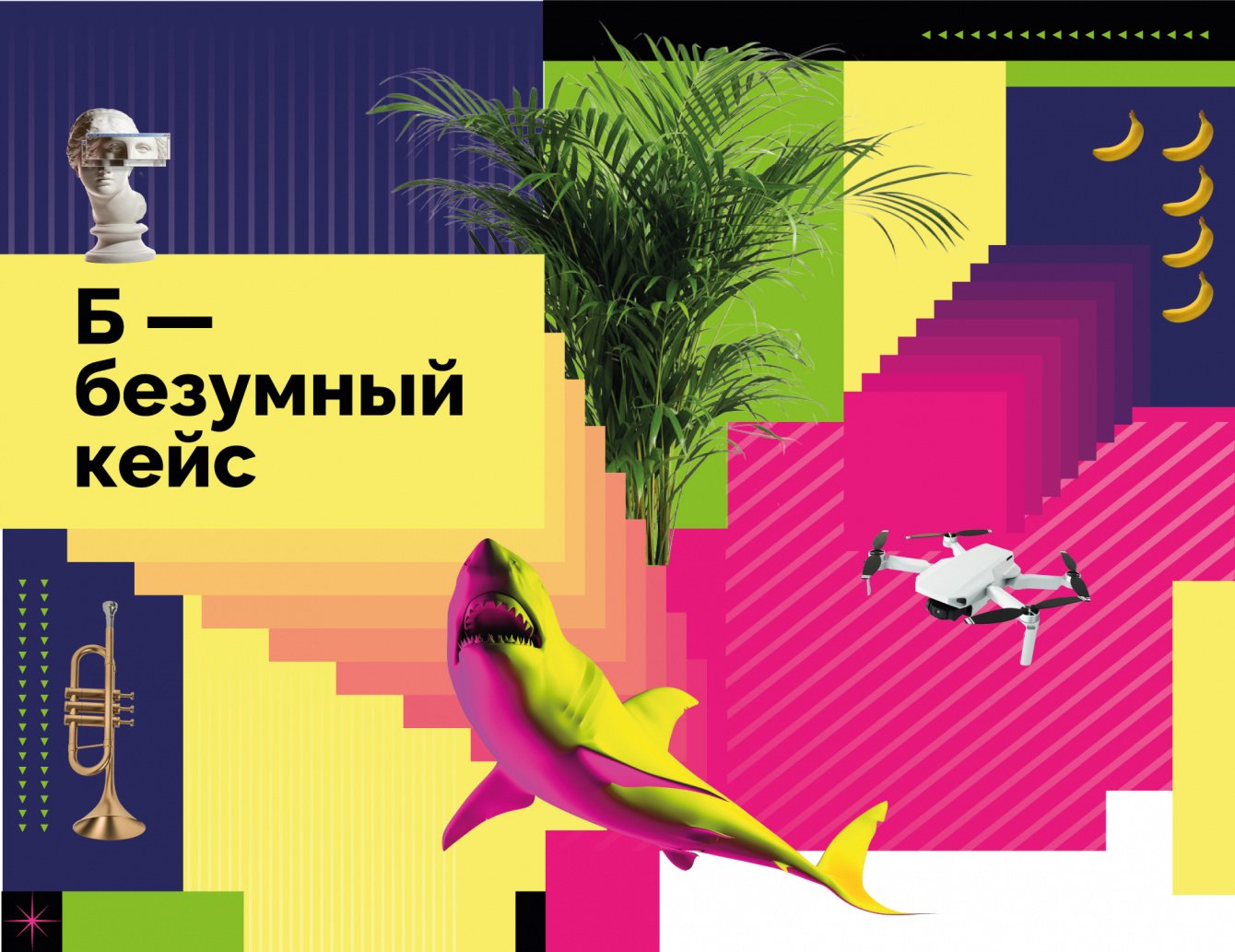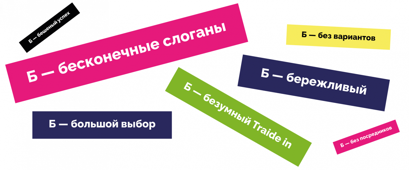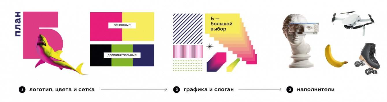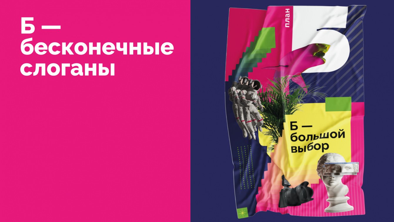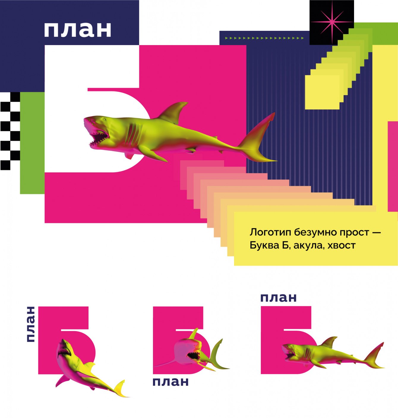 В результате айдентика состоит из гигантской буквы Б, розово-желтой акулы, четырех фирменных цветов и целого моря различных предметов, цепляющих глаз за счет абсурдности сочетаний. А также дополнительной графики и слоганов. Не то чтобы все это было крайне необходимо в айдентике, но если уж делаешь треш, то делать по полной.