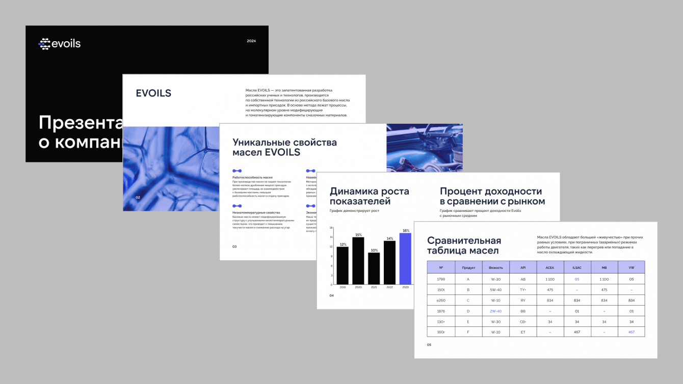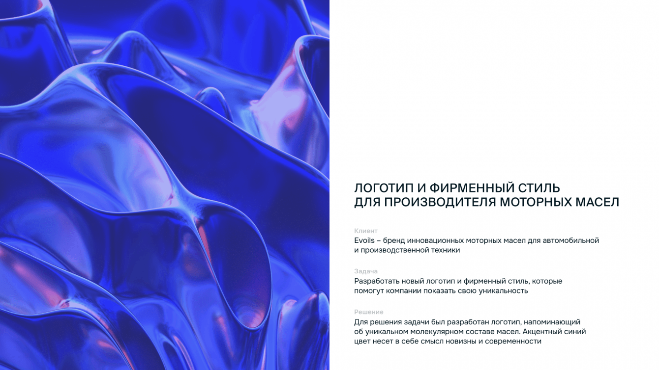 Для решения задачи был разработан логотип, напоминающий об уникальном молекулярном составе масел. Акцентный синий цвет несет в себе смысл новизны и современности