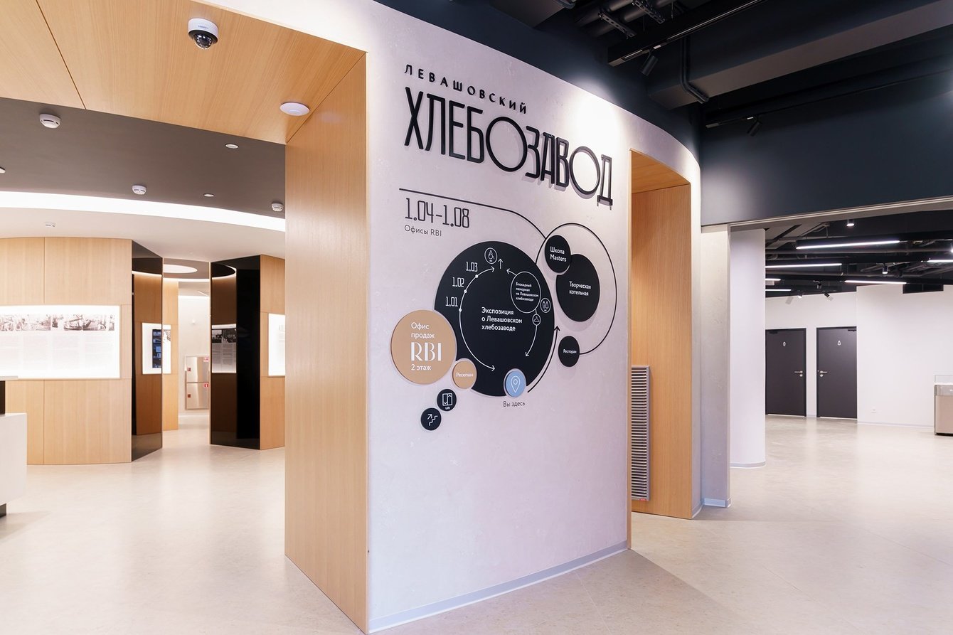 Наружными опорными пунктами стали стелы на подъездных путях к зданию и в сквере. Главным индикатором места — логотипы RBI и Левашовского хлебозавода на фасаде. Локальные указатели — надписи, цифры, обозначающие этаж и помещение — играют роль индикаторов внутри здания.