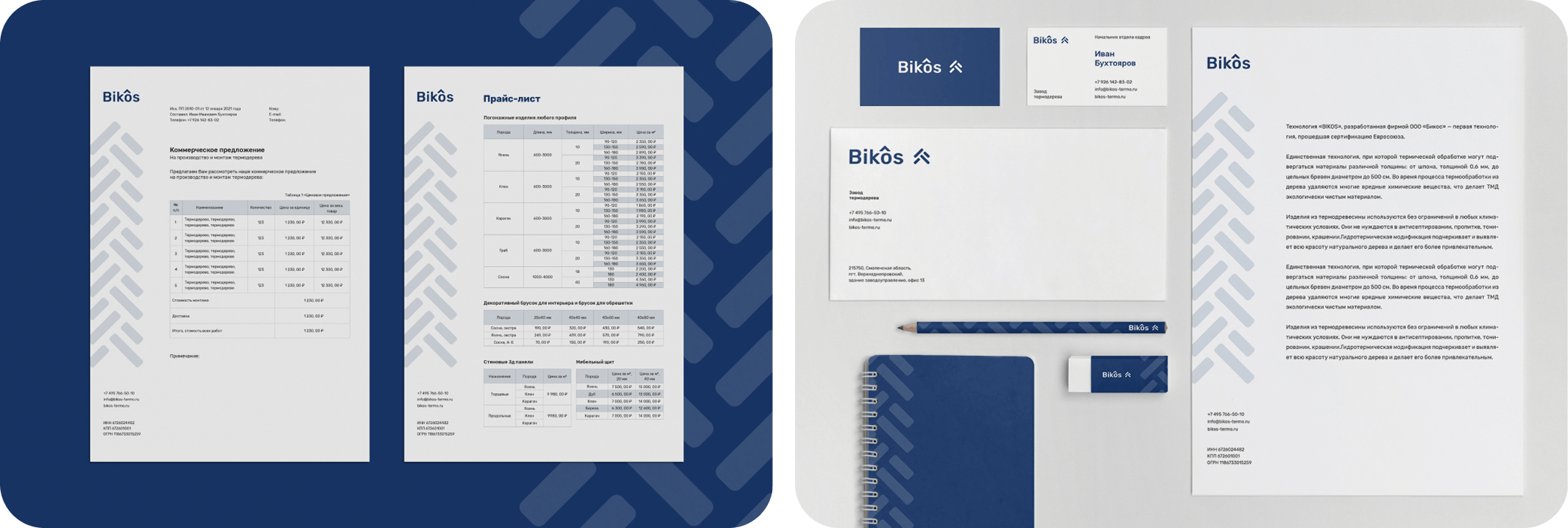 При создании логотипа мы провели анализ производства, технологий и истории зарождения бренда. Ключевой идеей для нас стала зарубежная запатентованная технология производства, которая не имеет аналогов на Российском рынке. Поэтому, мы создали дизайн логотипа с использованием зарубежных стандартов дизайна, что создает чувство уверенности и величины бренда у целевой аудитории. Фирменный знак лег в основу айдентики, имеет высокий потенциал к развитию и отражает в себе доски сложенные “ёлочкой”, что отсылает к продукту производственной компании «Bikos».