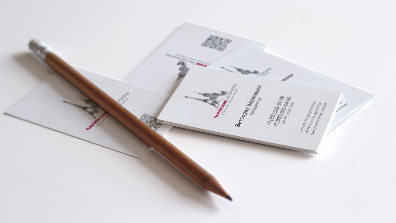 3. дизайн визиток — лаконичное черно-белое колористическое решение с винно-красным акцентом смотрится актуально и элегантно, как и проекты, создаваемые Архитектурным бюро «Парижские интерьеры».