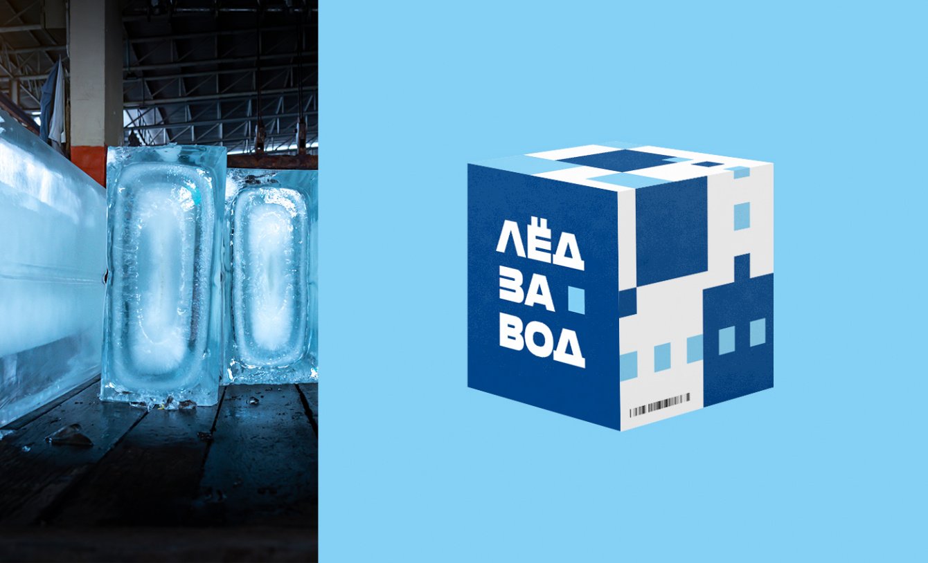 В науке есть понятие, что идеальная форма, это шар. Для льда тоже есть свой идеал – это квадрат. Название помещено внутри геометрической фигуры, где есть знак переноса в виде маленького квадрата, но уже другого цвета. Большие и малые прямые формы, символизируют различные размеры и формы льда, которые может производить ЛЁД-ЗАВОД.