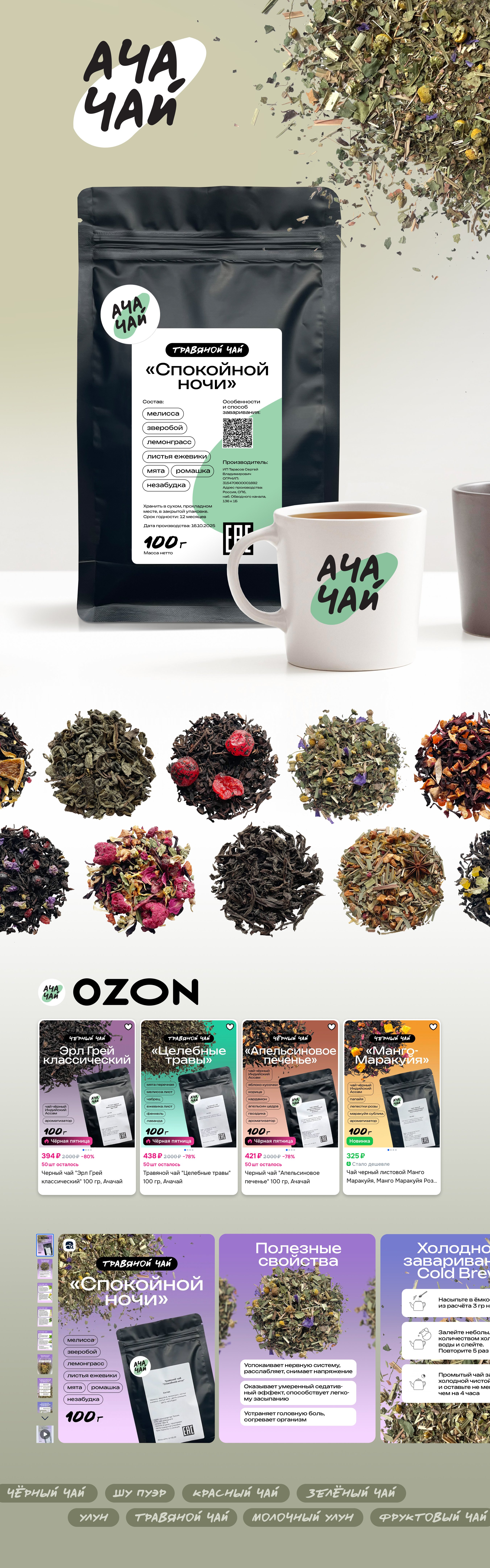 В рамках проекта провели фотосъёмку 44 сортов чая, детально передав их компоненты, цвет и текстуру. Разработали дизайн этикеток, а также карточки товаров для Ozon — лаконичные, привлекательные и ориентированные на повышение конверсии.