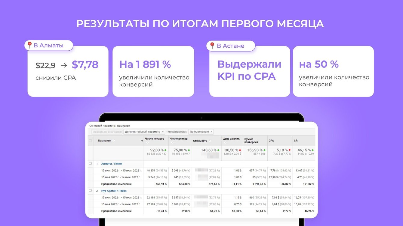 Благодаря тщательному анализу данных и четкому фокусу на наиболее важных точках роста, мы смогли добиться отличных показателей всего за 1 месяц работы.