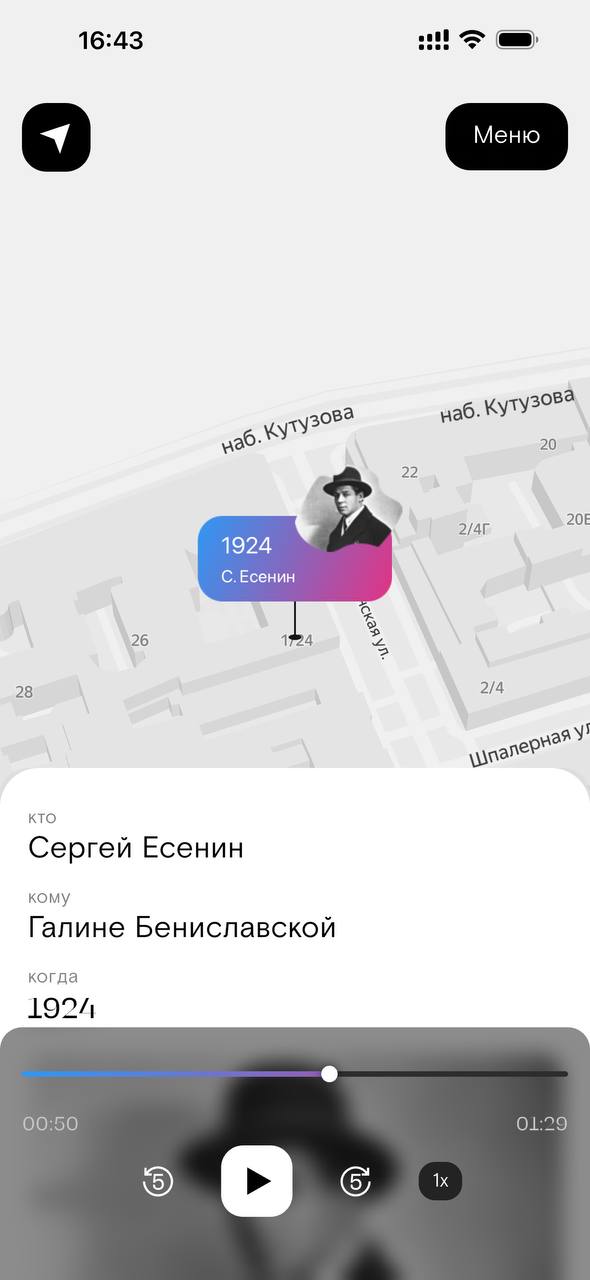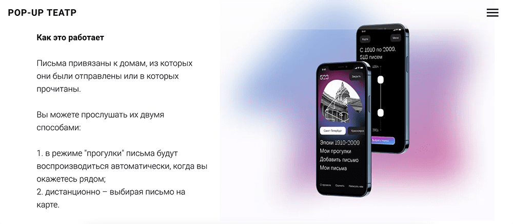 В первой версии приложения сотни любовных писем были привязаны к реальным домам в Петербурге. Прогуливаясь по городу и слушая переписки исторических личностей аудитория участвует в театральном перформансе.