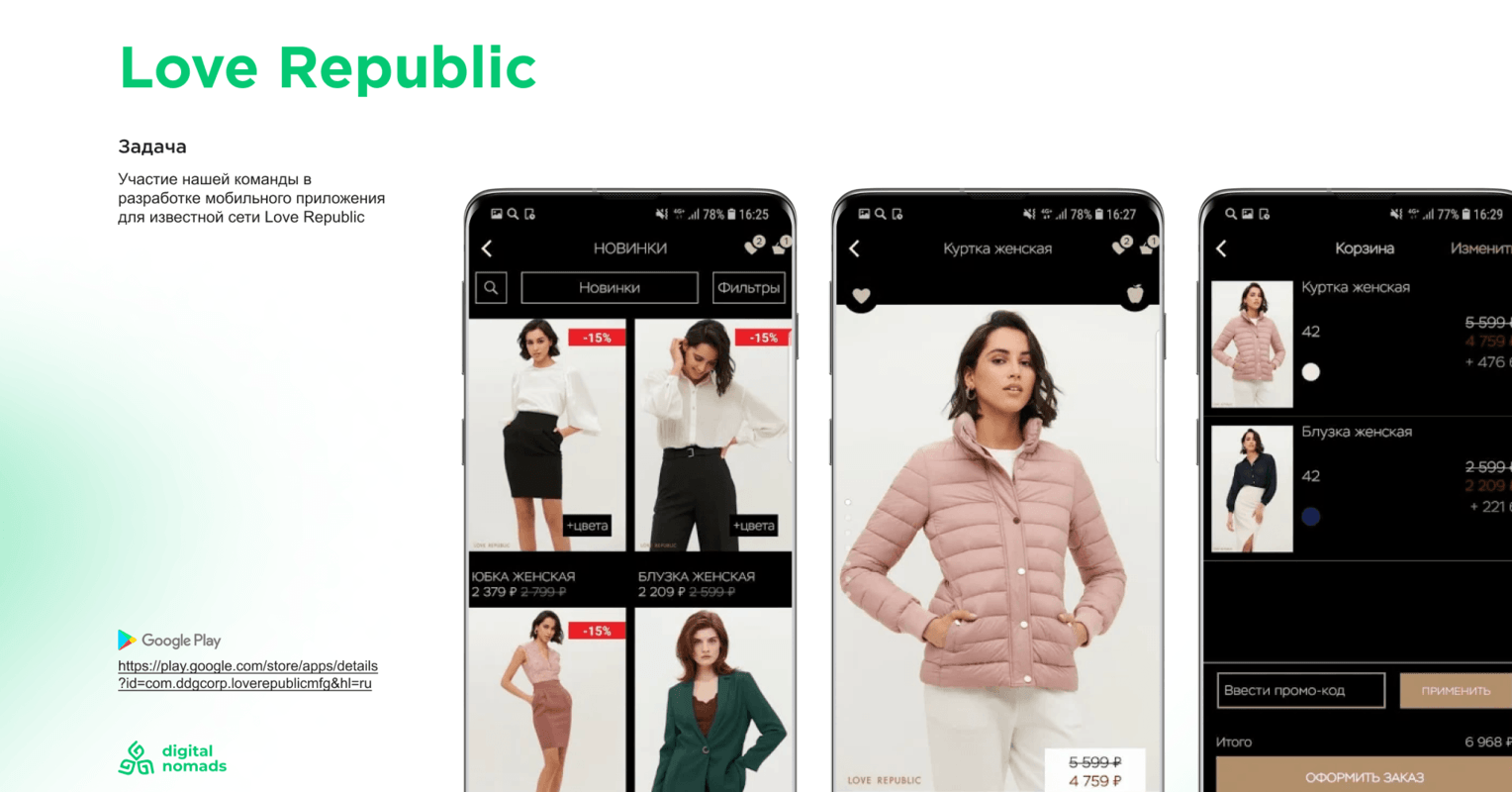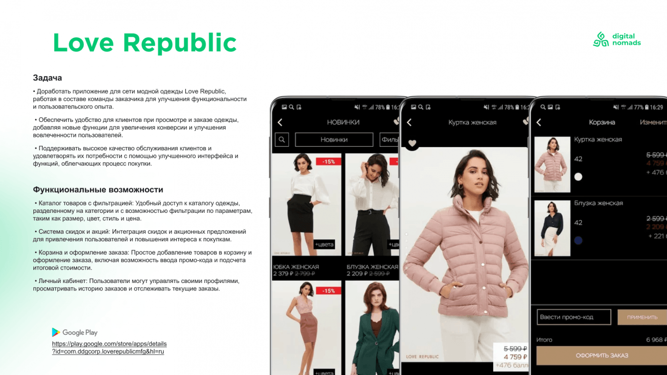 Love Republic — это модное и функциональное приложение для онлайн-шопинга, которое облегчает клиентам поиск и покупку стильной одежды. Благодаря удобному интерфейсу, продуманной навигации и встроенным акциям приложение помогает бренду увеличить вовлеченность пользователей и объем продаж, а также поддерживать высокий уровень лояльности среди клиентов.
