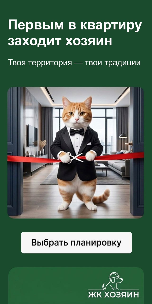 1. Эмоциональный триггер. Животные — сильный визуальный крючок, вызывающий доверие и умиление. Мы планировали «зацепить» пользователя и побудить его изучить баннер, даже если он не находится в активном поиске жилья прямо сейчас.
