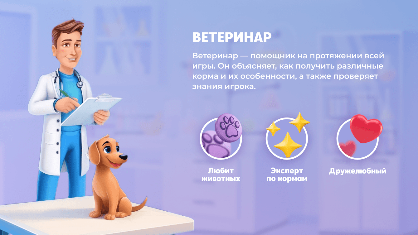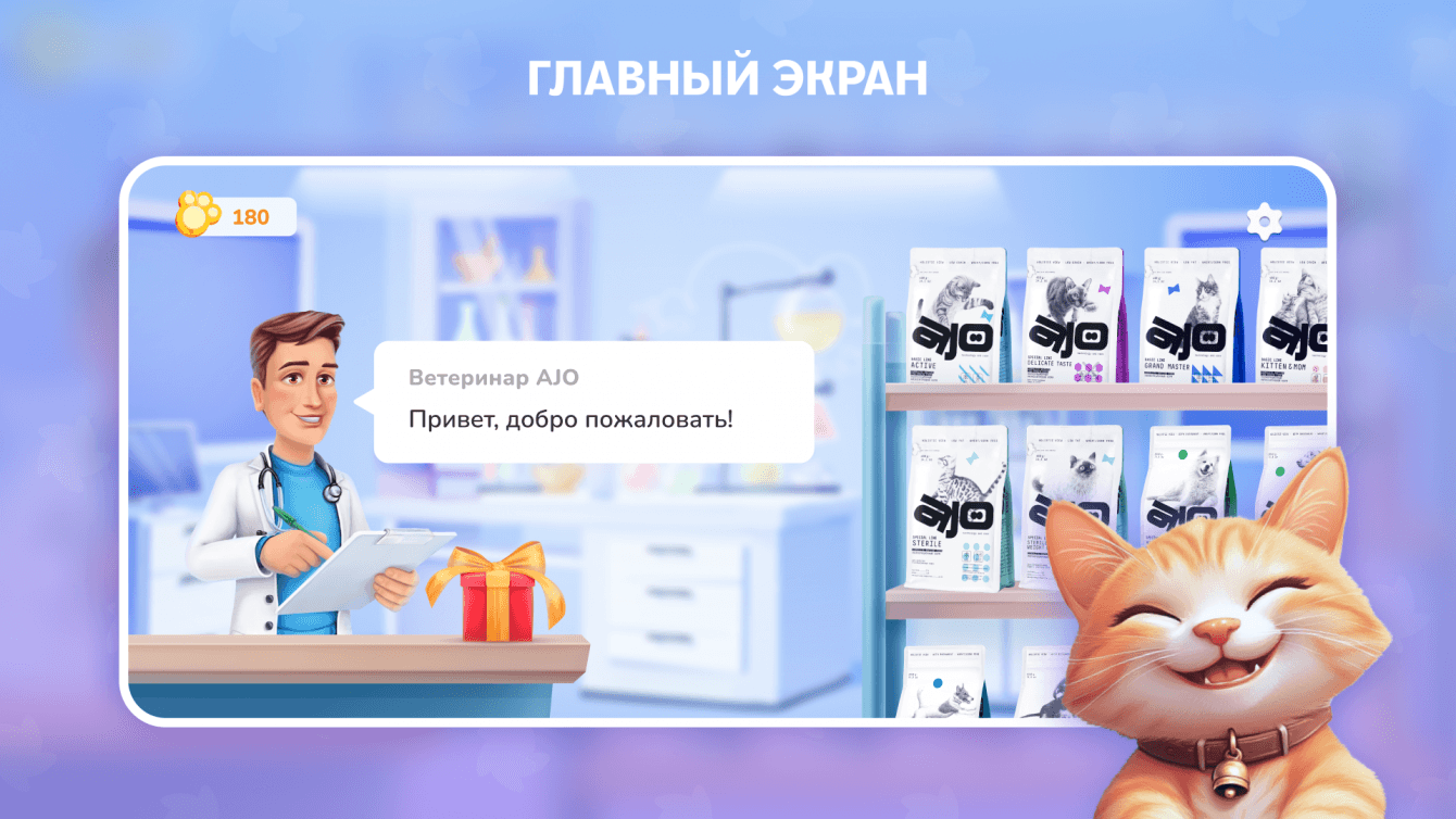 На стартовом экране пользователя встречает виртуальный помощник — гид «Ветеринар AJO». Он рассказывает о ключевых особенностях каждого продукта, помогая продавцам понимать, чем конкретный корм выделяется среди других.