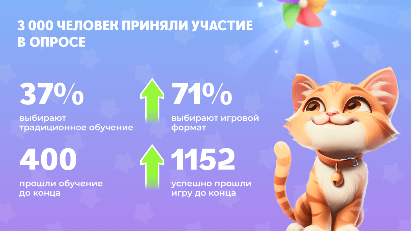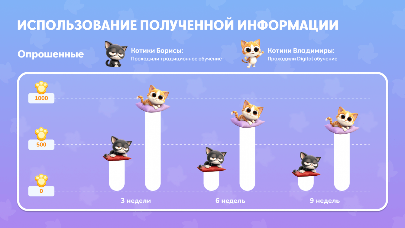 Внедрение digital-инструмента обучения дало ощутимые результаты: 71% продавцов выбрали игровой формат вместо видеоматериалов, из которых 37% завершили игру и успешно прошли подготовку. В сравнении с предыдущими показателями, где только 13% сотрудников досматривали видео до конца и проходили тест, видно, что такой формат значительно повышает вовлеченность. Благодаря «Лаборатории AJO», каждый третий продавец стал использовать полученные знания при общении с клиентами, что привело к существенному росту продажи новой линейки кормов, а также снизило расходы на продвижение продуктов за счет более эффективного использования УТП.