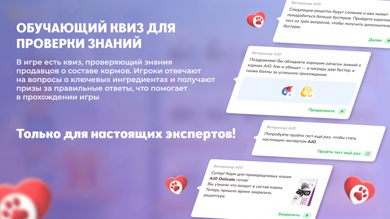 После прохождения нескольких уровней игроки выполняют тест. Продавцы подтверждают знания о составе и особенностях продукции. За правильные ответы они получают призы от компании. Это поощряет активное участие в обучении и помогает сделать процесс усвоения информации более эффективным.