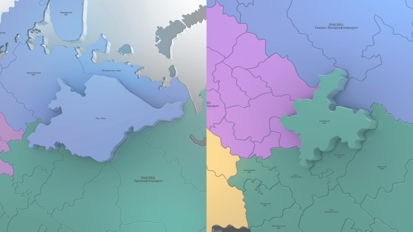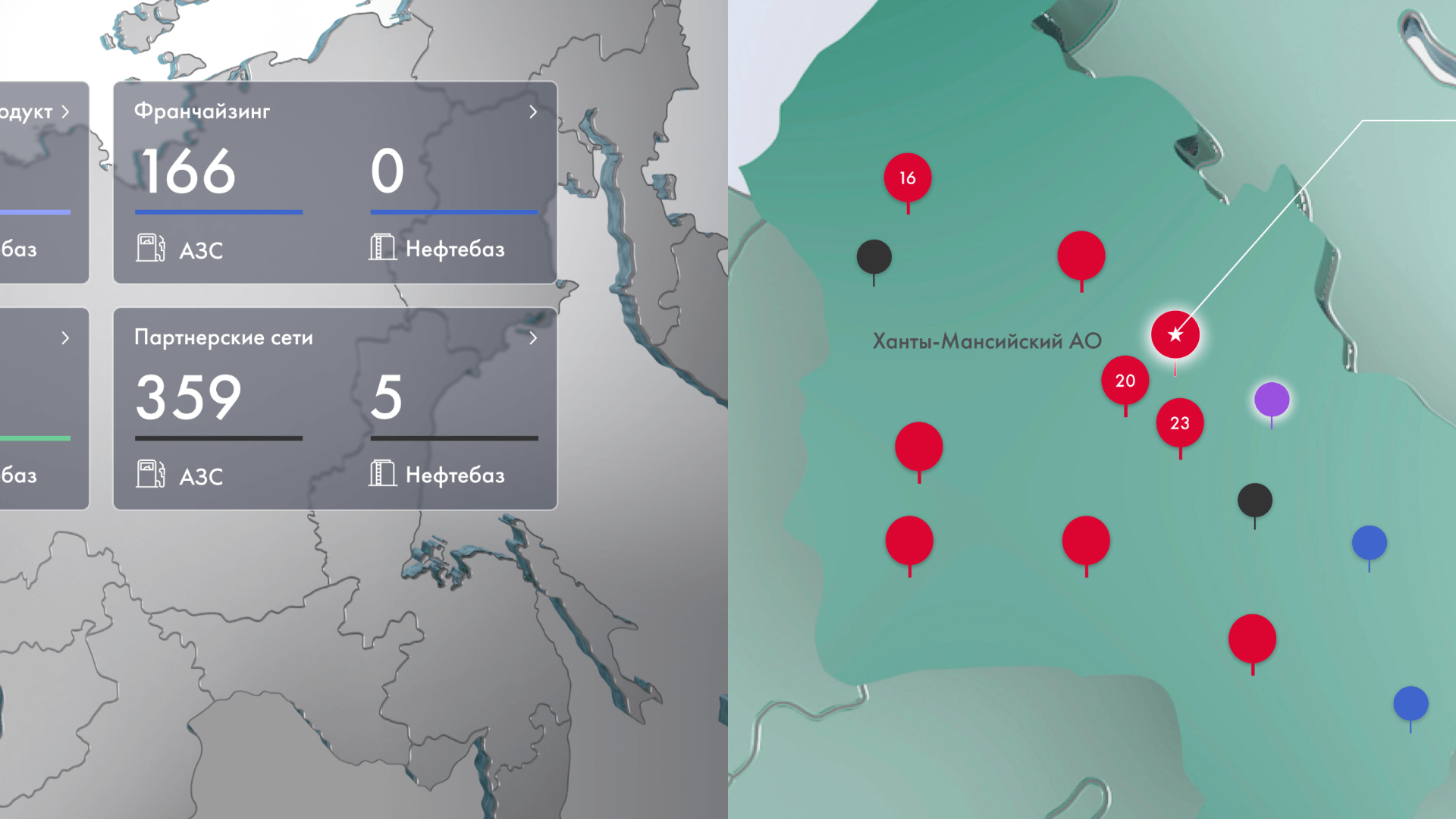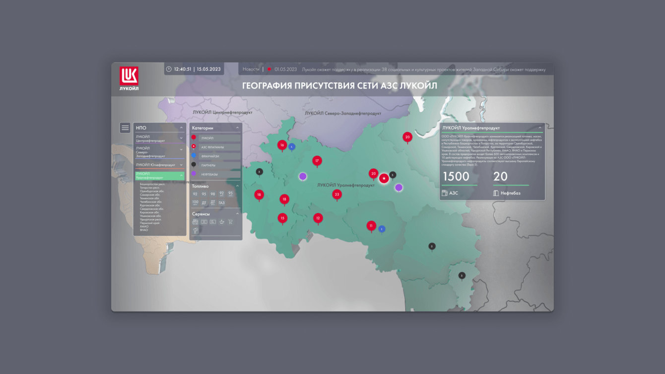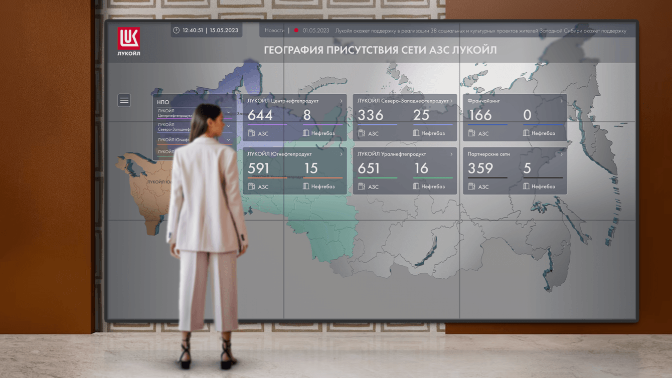 Одну из стен в холле центрального офиса, непосредственно рядом с кабинетом генерального директора компании ЛУКОЙЛ, занимает большой сенсорный экран, на котором транслируются промо-ролики и другая имиджевая информация для посетителей офиса — клиентов, партнёров и гостей. Нам поручили разработать специальный интерфейс, чтобы на экране можно было ознакомиться с географией расположения объектов компании и получить информацию о них в интерактивном режиме.