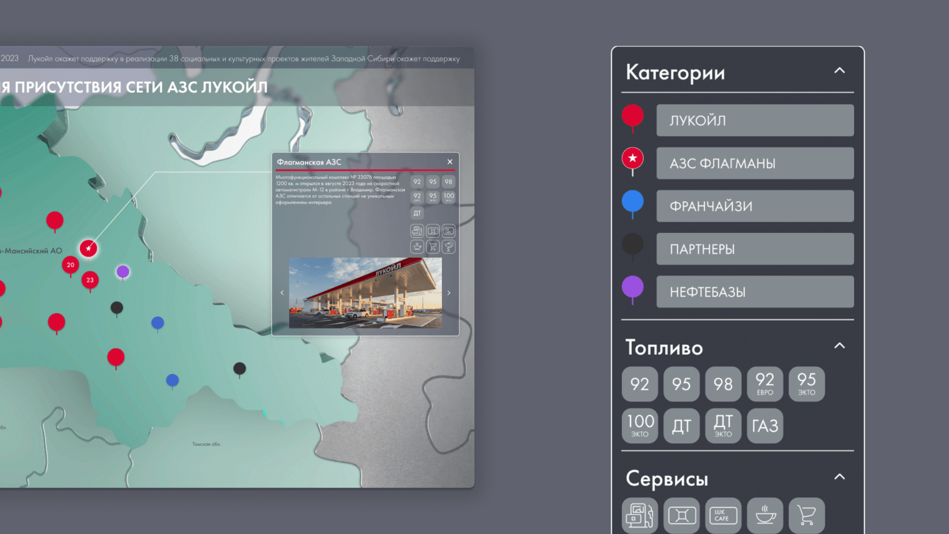 Разработали интерфейс и дизайн для интерактивной карты географии присутствия компании ЛУКОЙЛ — одной из крупнейших и наиболее эффективных нефтегазовых компаний России.