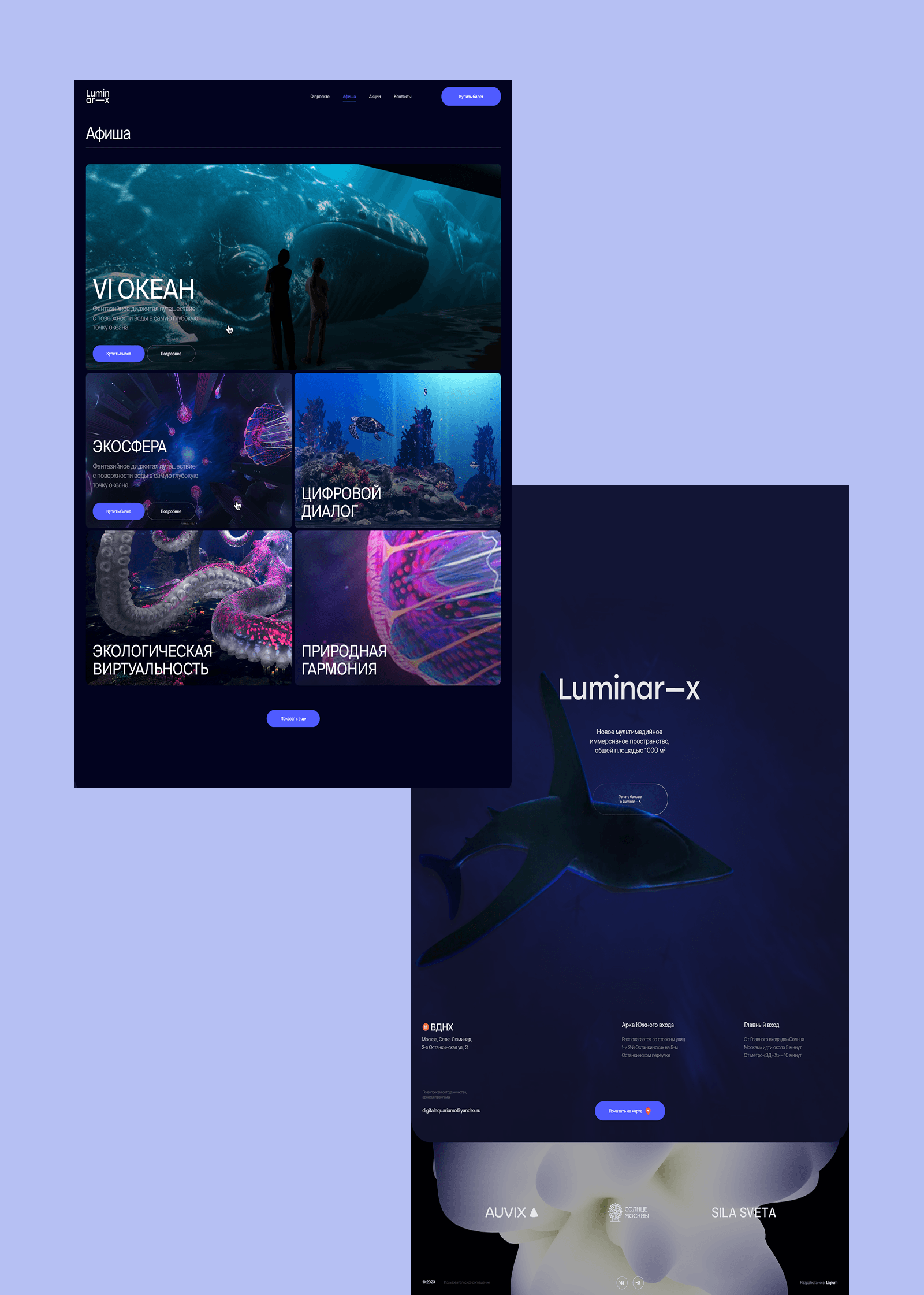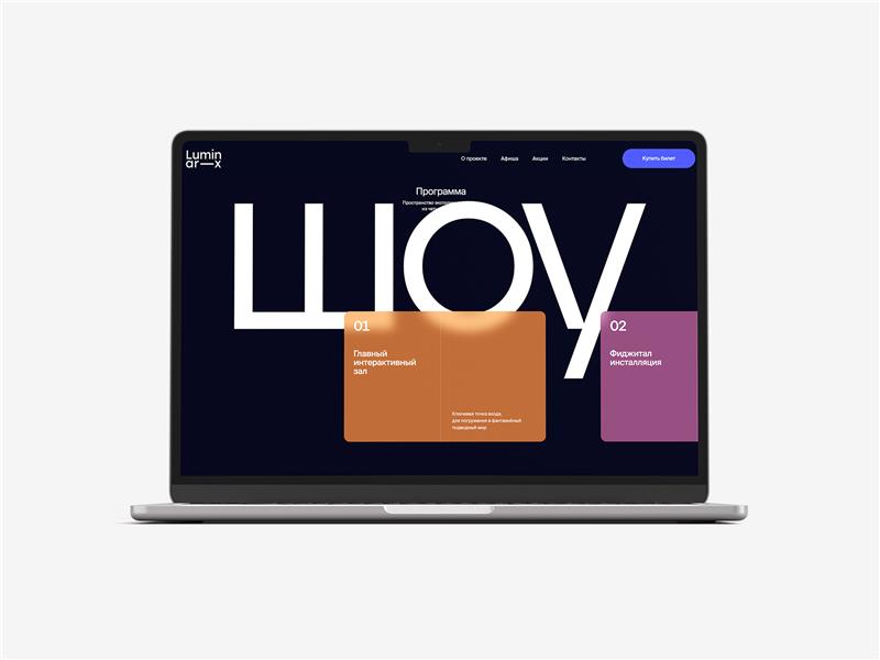 Задачей сайта являлось донести до пользователя все возможности и особенности иммерсивного пространства и, при этом, иметь все базовые возможности для редактирования и обновления информации о новых шоу.