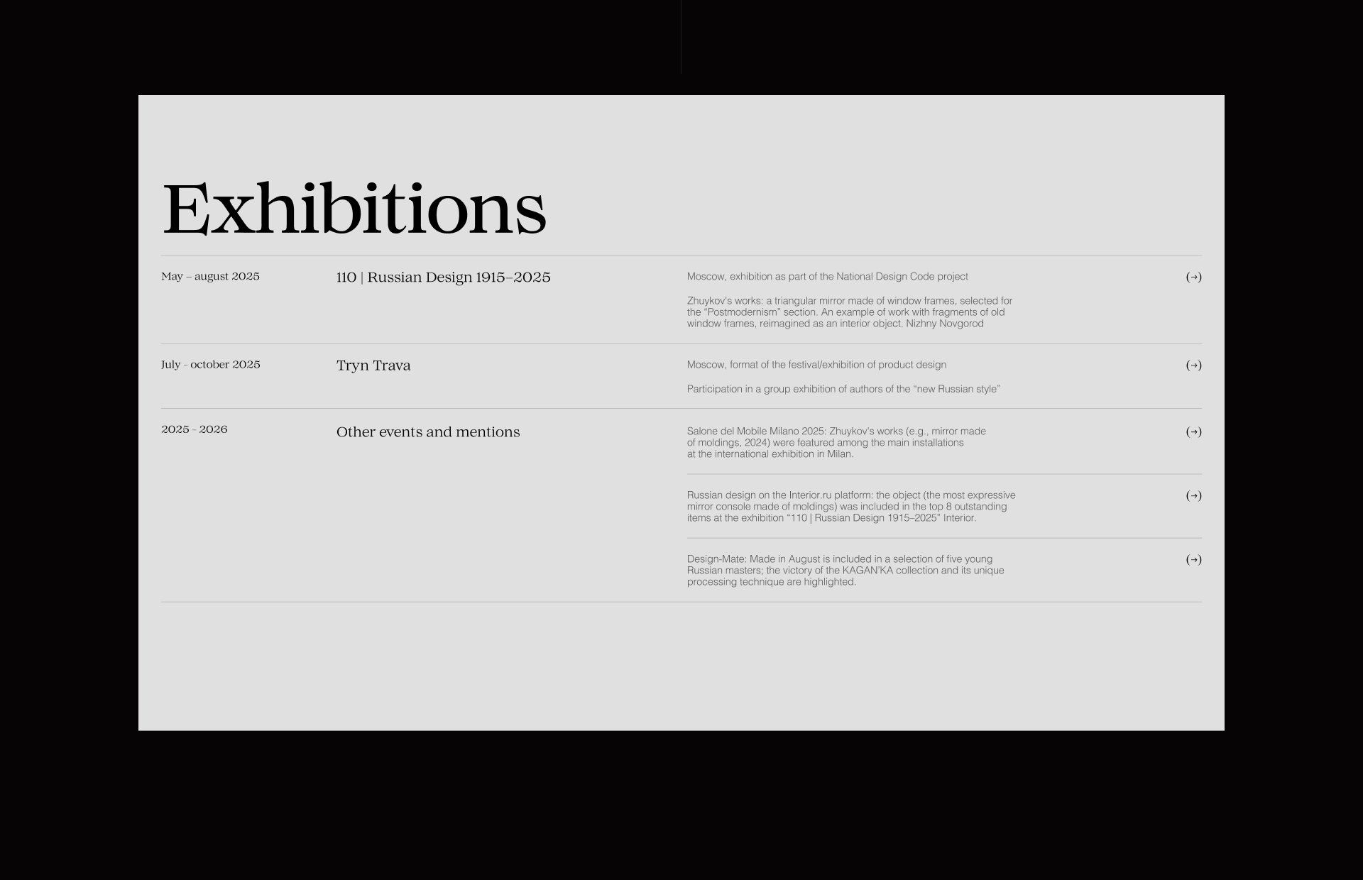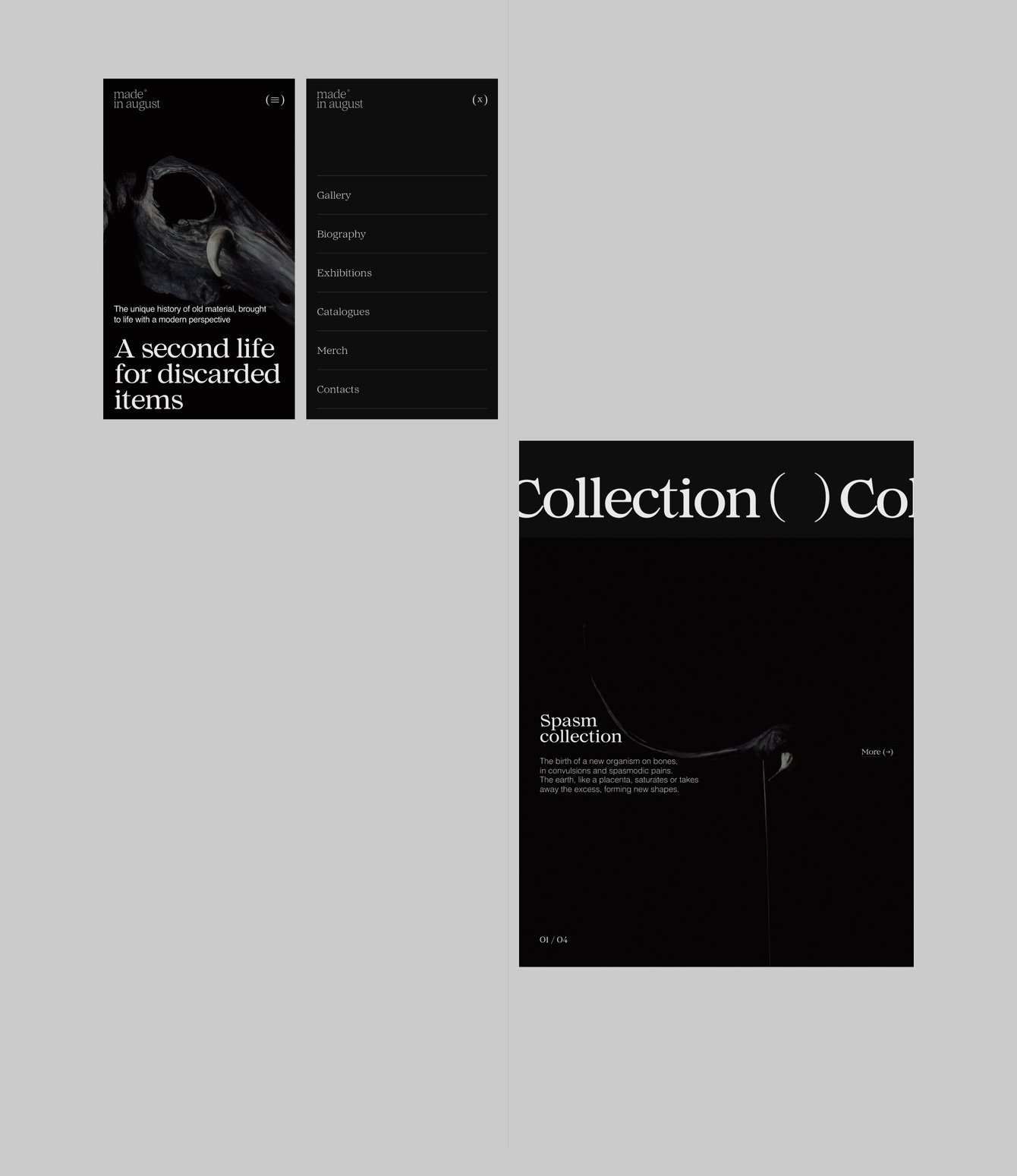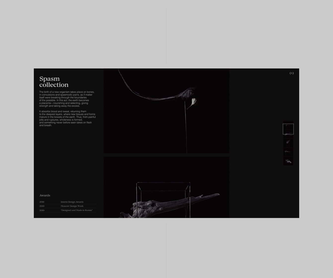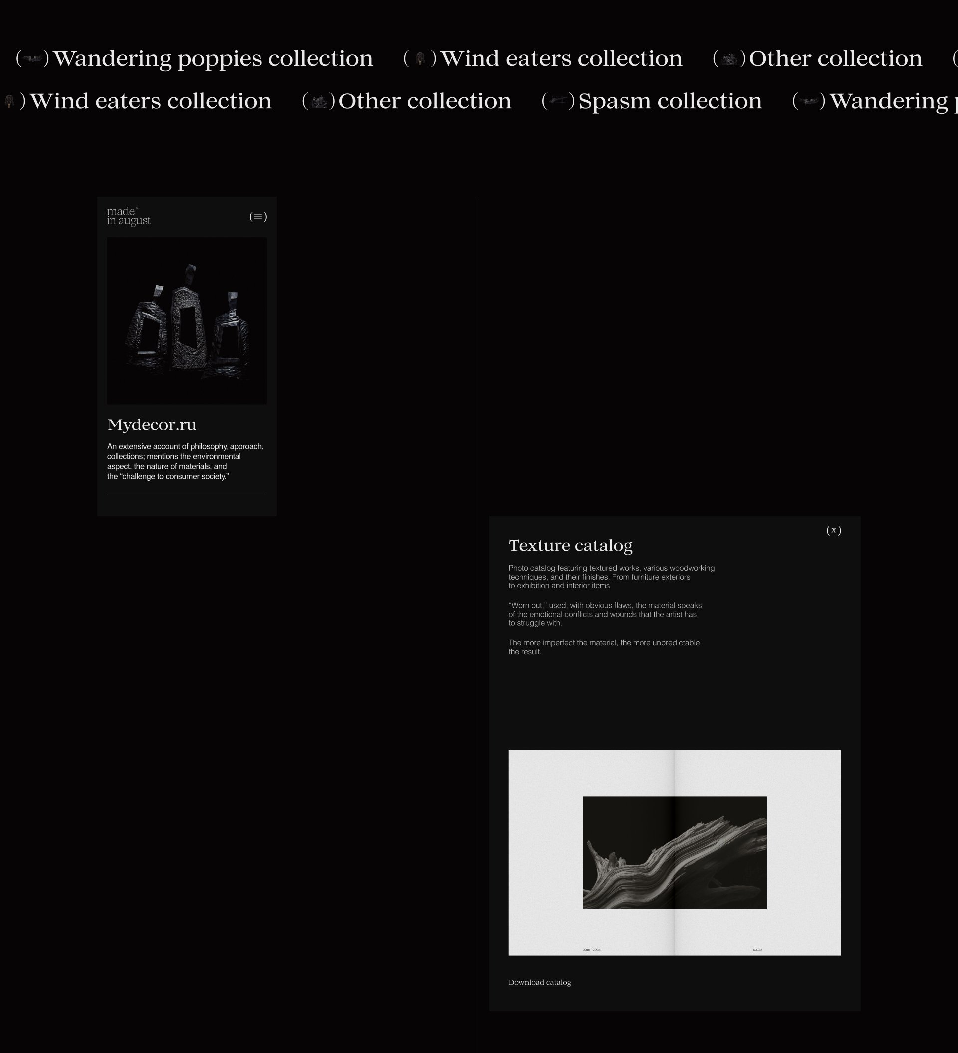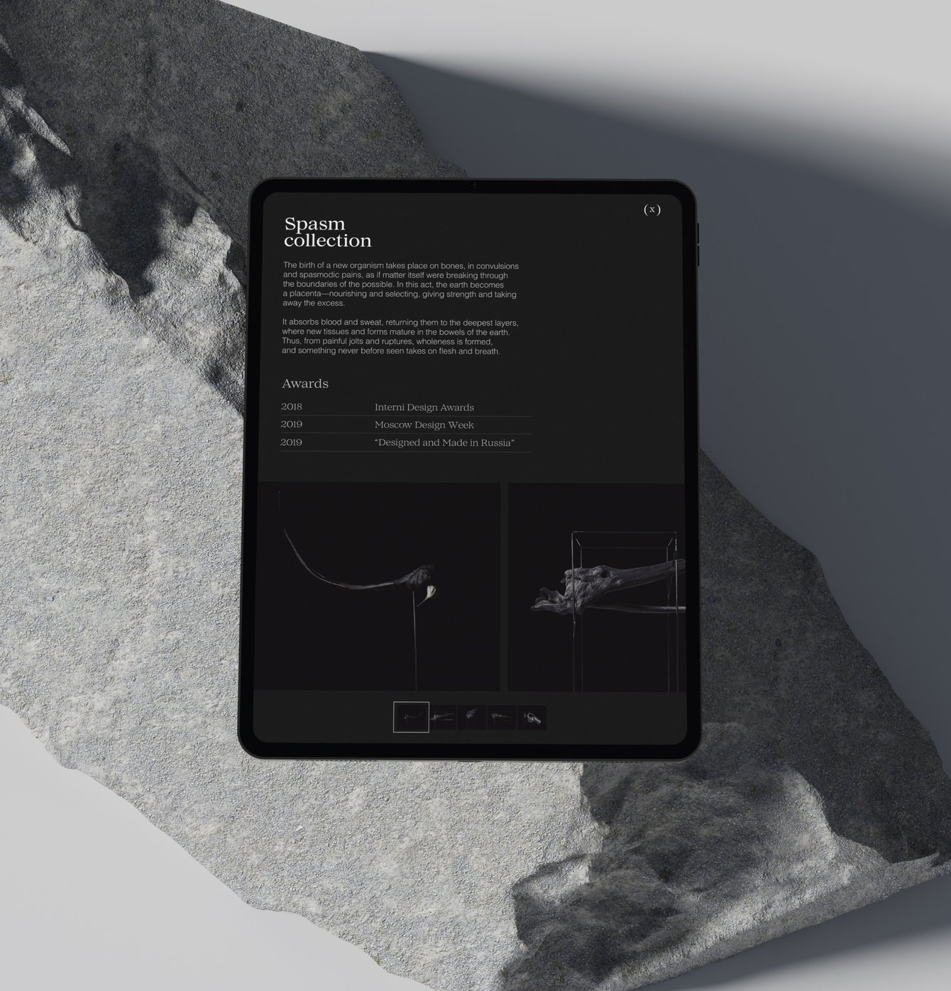 Сайт остаётся таким же честным и сдержанным, как и сами объекты. Он не перегружает деталями, а работает как цифровая галерея, где внимание сосредоточено на коллекциях и философии.