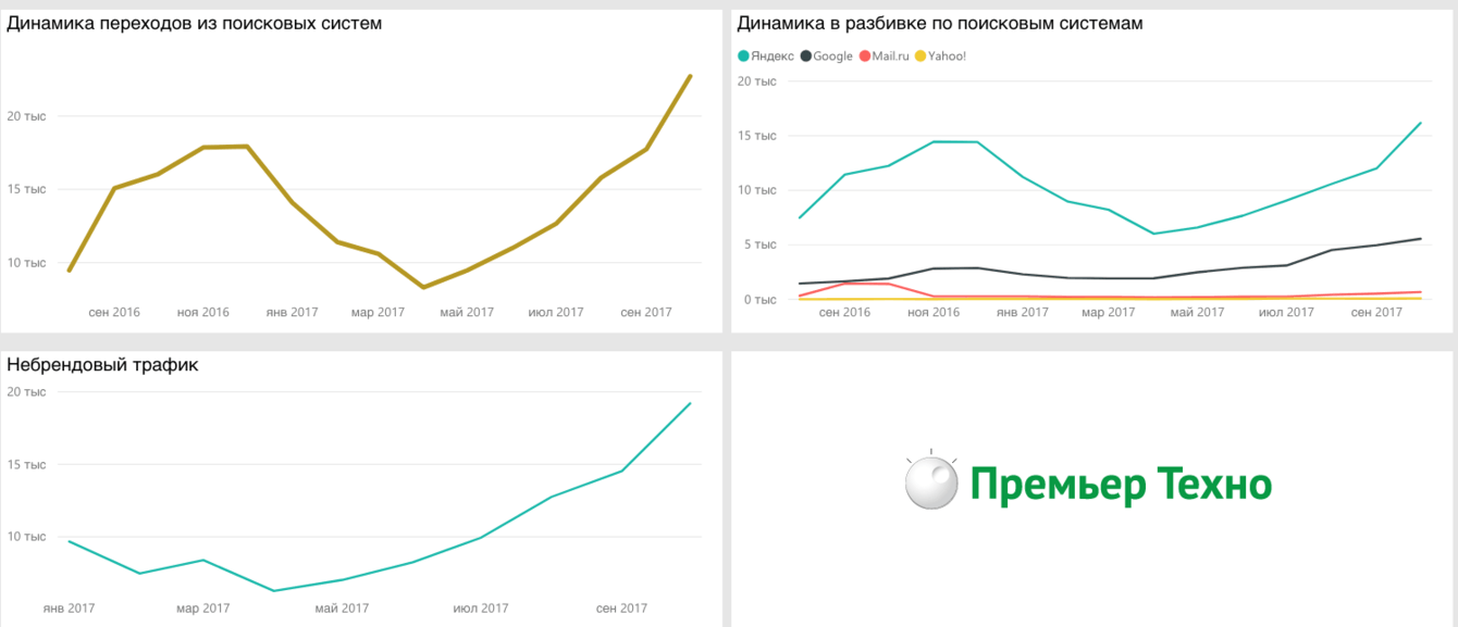 - Итогом стал рост посещаемости из поисковых систем по небрендовому трафику в полтора раза(с учетом сезонности), в 2 раза увеличилось число проиндексированных страниц, доход с поиска вырос в 2,5 раза