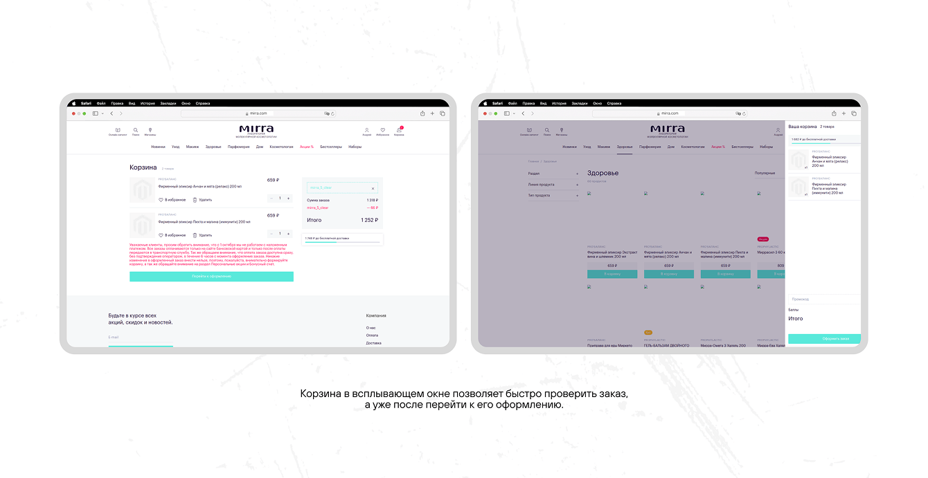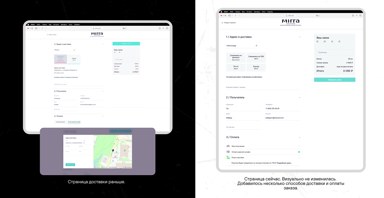 Полгода назад онлайн-магазин Mirra попал к нам. Предыдущий IT-подрядчик выполнил некоторые работы по функционалу: в магазине можно было зарегистрироваться, сложить товар в корзину и сделать заказ. Страдали UX и работоспособность части функционала. Товар в интернет-магазине косметики mirra.ru можно было купить, но при оформлении заказа часто всплывали ошибки разного характера. С этими проблемами и предстояло разобраться в первую очередь.