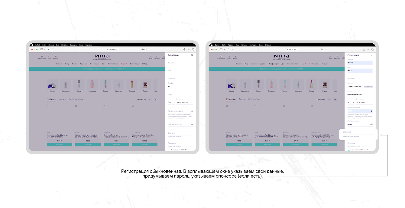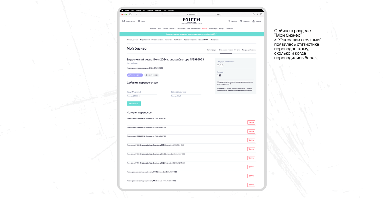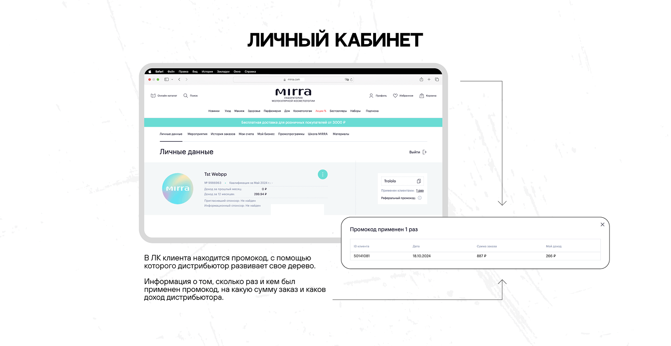 На момент 2024 основной клиент mirra.ru — дистрибьютор, работающий по MLM-системе. Доход от дистрибьюторской сети составляет 30-40% от общего числа форматов продаж. В этом большая мотивация делать покупки через сайт максимально удобными и легкими, чтобы их было больше. Сам личный кабинет должен стать персональной картой бизнеса для каждого дистрибьютора: чтобы он мог в любое время зайти в свой личный кабинет и понять, как его бизнес выглядит сейчас и как его можно улучшить.