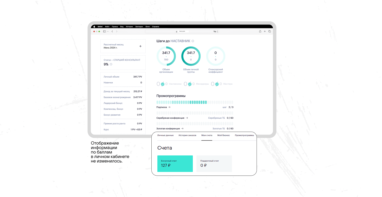 Баллы (PV) — это данные, по которым дистрибьюторам платят вознаграждение. Дистрибьютор и его «подчиненные» копят баллы, покупая косметику и выполняя другие условия маркетинг-плана. В конце каждого месяца выплачивается вознаграждение. Оно зависит от количества баллов у дистрибьютора и у всех участников его дерева продаж. Чтобы выполнить маркетинг-план и получить большее вознаграждение, участники одного дерева продаж могут обмениваться баллами в личном кабинете на сайте.