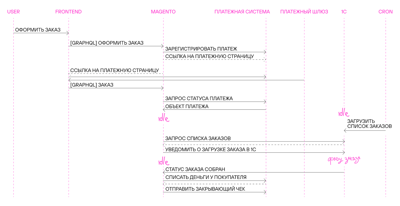 «Путь информации выглядит так: данные о том, на какой стадии находится заказ: оплачен, собран, передан в доставку и т.д. передаются в Magento, затем идут в ЮKassa. После оплаты данные заказа и оплаты идут в 1С».