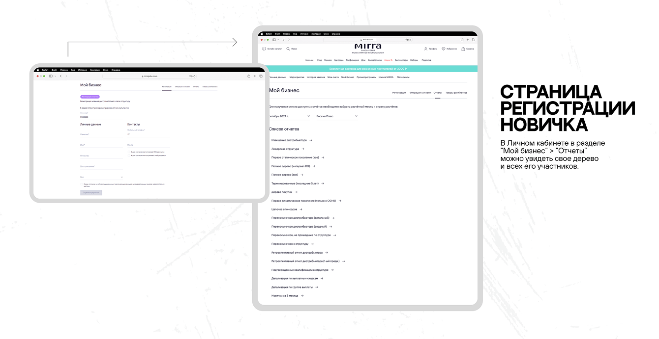 На момент 2024 основной клиент mirra.ru — дистрибьютор, работающий по MLM-системе. Доход от дистрибьюторской сети составляет 30-40% от общего числа форматов продаж. В этом большая мотивация делать покупки через сайт максимально удобными и легкими, чтобы их было больше. Сам личный кабинет должен стать персональной картой бизнеса для каждого дистрибьютора: чтобы он мог в любое время зайти в свой личный кабинет и понять, как его бизнес выглядит сейчас и как его можно улучшить.